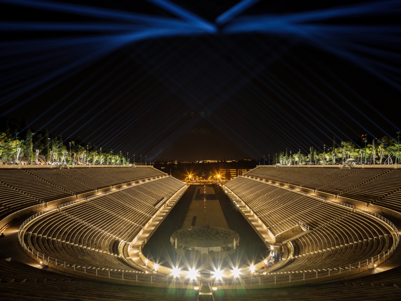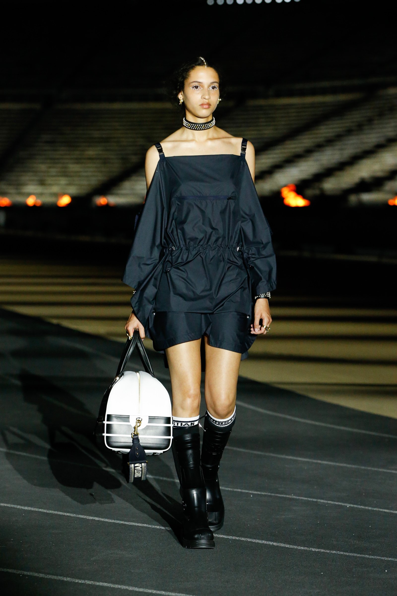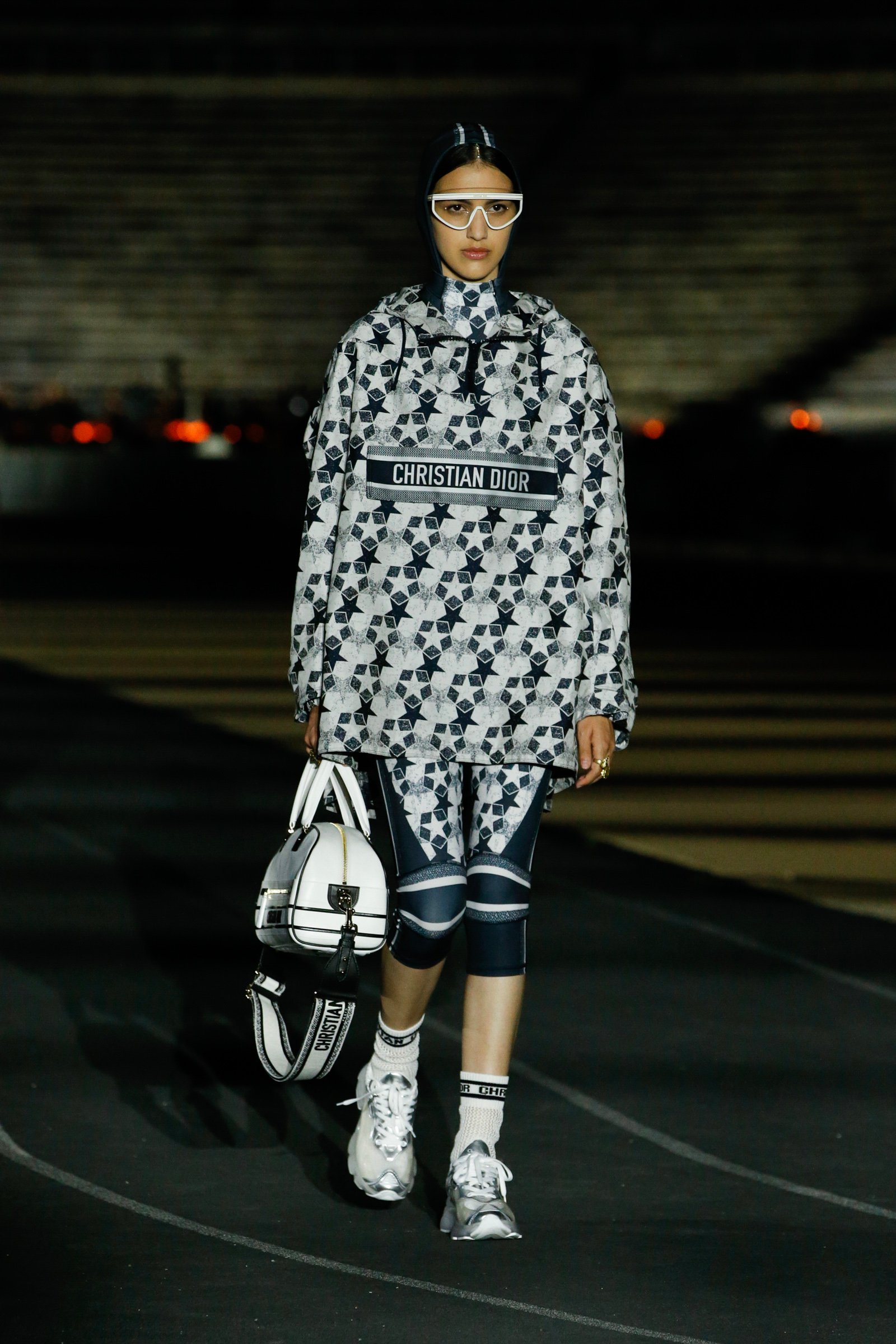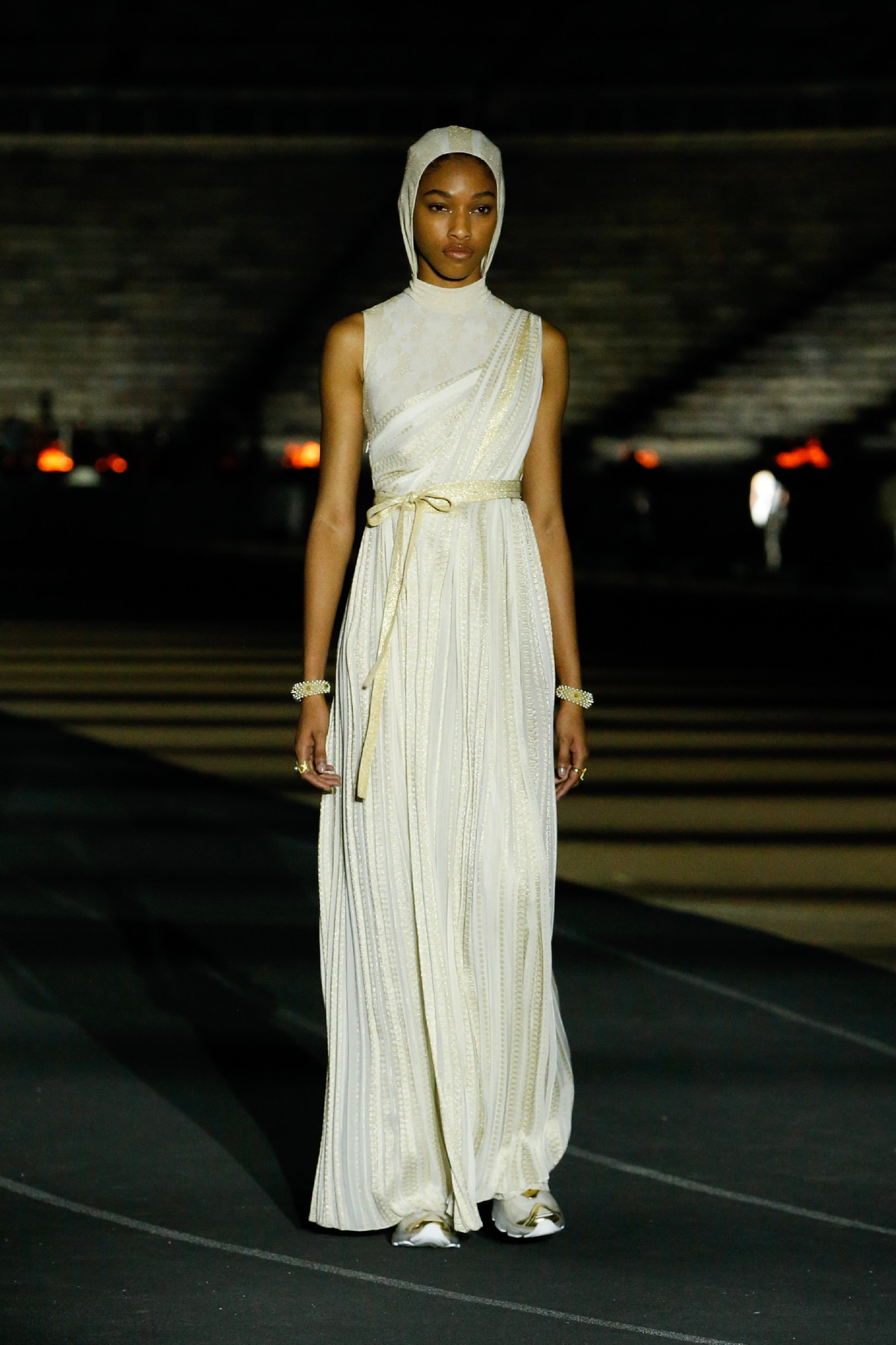 紀元前329年に建設され、1896年に第1回近代オリンピックが開かれた歴史的な建造物。ギリシャ・アテネのパナシナイコスタジアムで、「ディオール(DIOR)」の2022年クルーズコレクションが発表された。たいまつの炎が照らす荘厳なムードのトラックをランウェイに、ギリシャ神話に登場する女神の装いと現代のスポーツウェアから抽出したアスレチック要素が融合した。