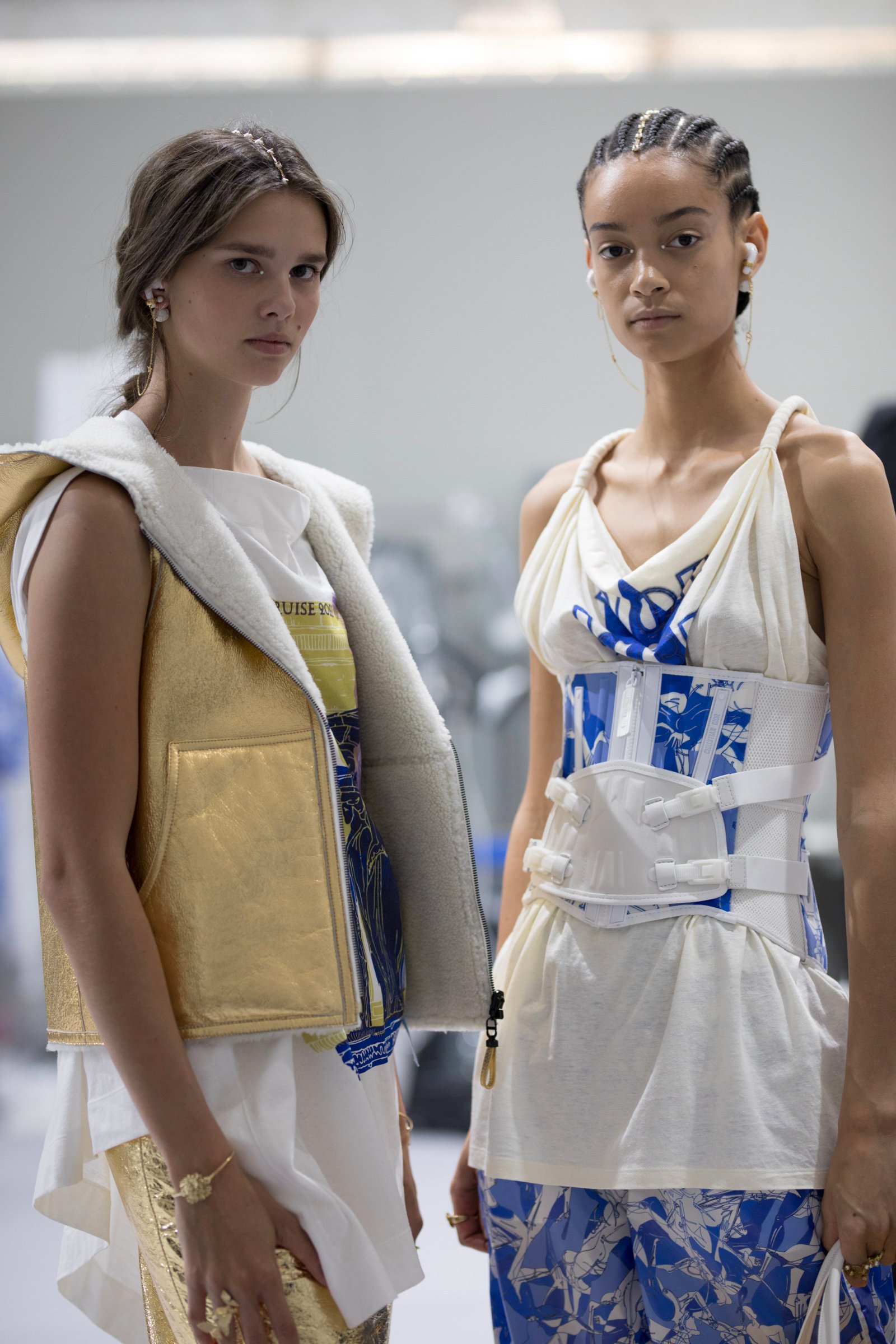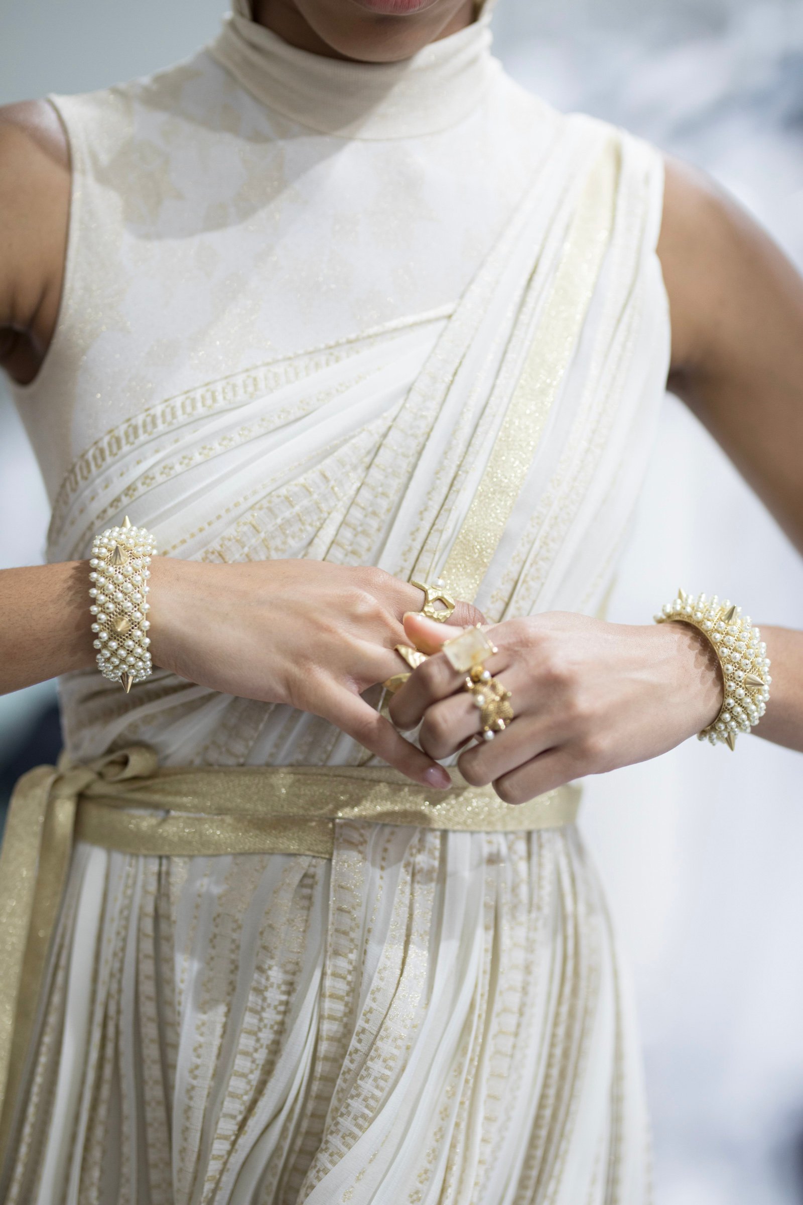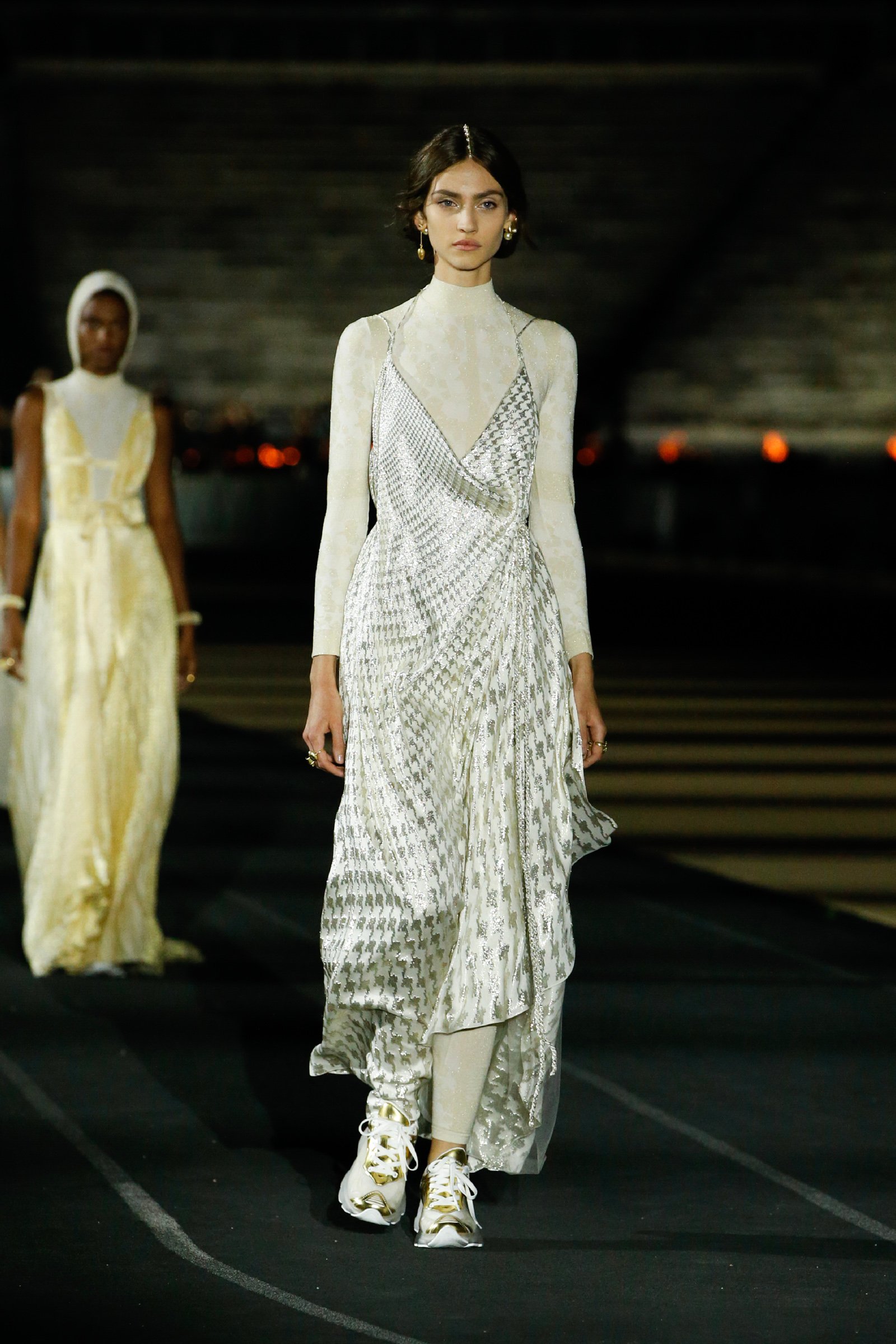 終盤は、清らかなホワイトをベースとしたイブニングドレス。長いトレーンや白鳥を模したデザインなど詩的で優美なドレススタイルに、足元にスニーカーを合わせているのが今シーズンの特徴だ。スニーカーはホワイトとゴールドの配色で、アクセサリーの一部となっている。
