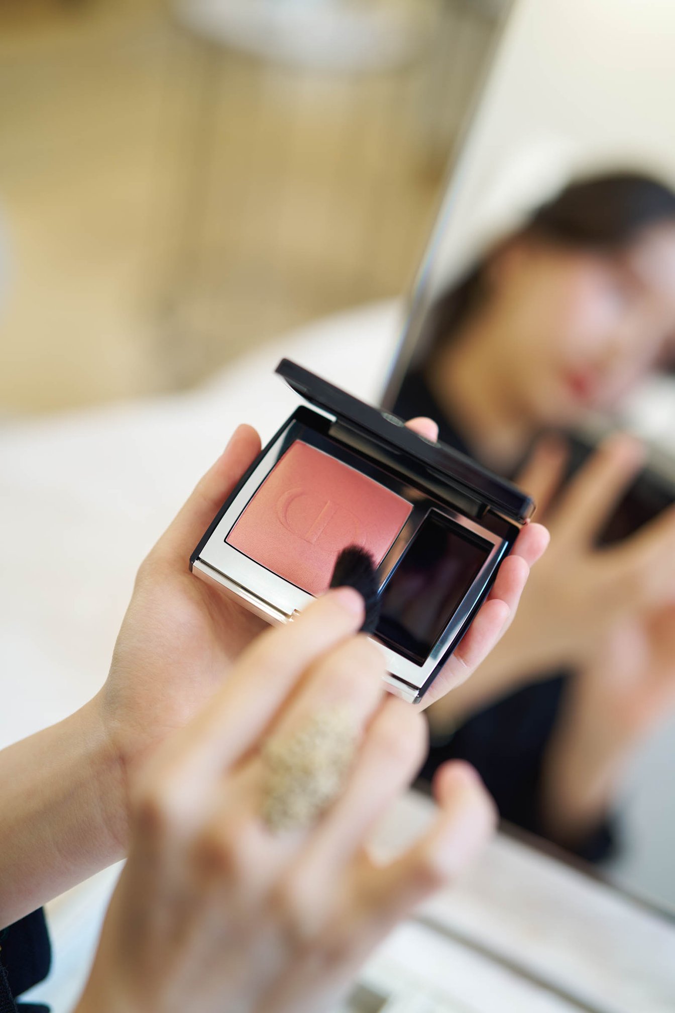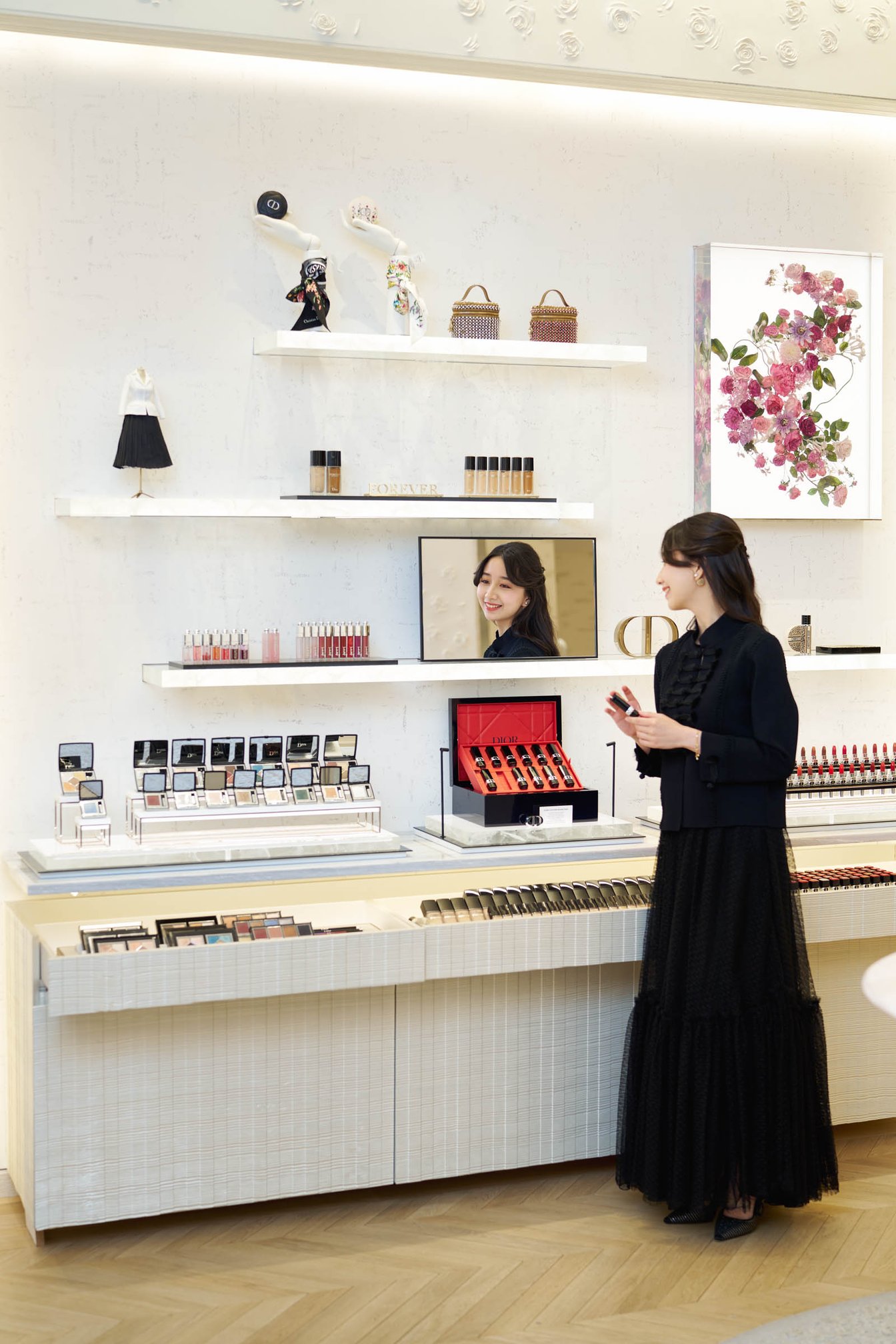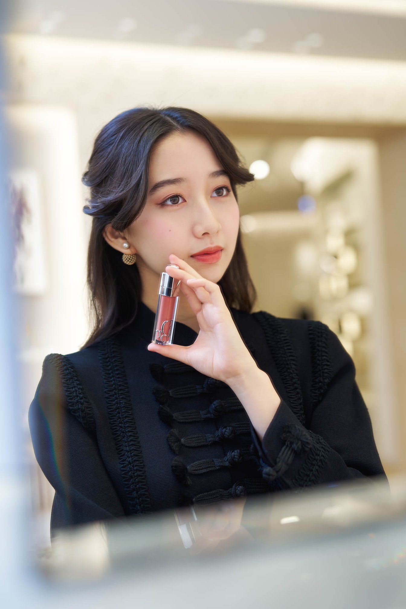 エントランスを入って右奥に構えるビューティコーナーでCocomiが手に取ったのは、ディオール アディクト リップ マキシマイザーや、リニューアルした「ディオールスキン ルージュ ブラッシュ」(全16色 各税込7150円)。ブラッシュは、アイリスやパンジー、レッドハイビスカスエキスなど自然由来指数90%(水1%を含む、ISO16128準拠)を自然由来成分で構成したフォーミュラでシルクのようにやわらかく肌になじみ、高配合のピグメントが肌の内側から上気したような自然な血色感を叶える。