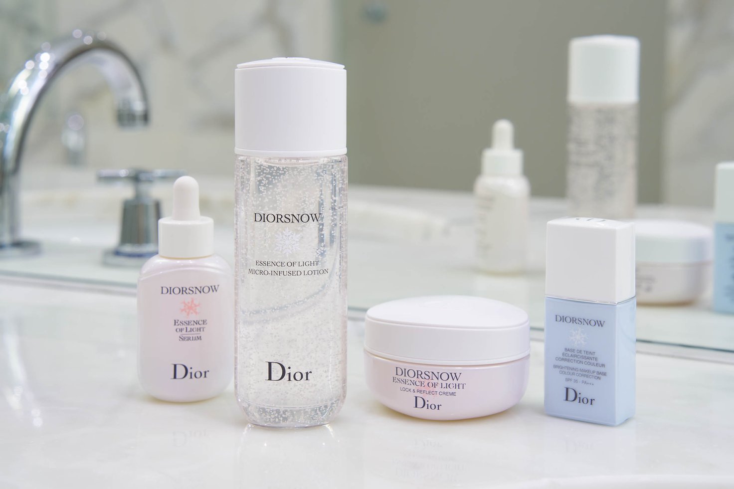 左から、美容液「ディオール スノー アルティメット エッセンス オブ ライト」(30mL 1万9580円)、化粧水「ディオール スノー エッセンス オブ ライト マイクロ ローション」(175mL 8250円)、クリーム「ディオール スノー エッセンス オブ ライト クリーム 」(50mL 1万5950円)※いずれも医薬部外品、UV下地「ディオール スノー メイクアップ ベース UV35」(SPF35・PA+++、30mL 6820円/いずれも税込)