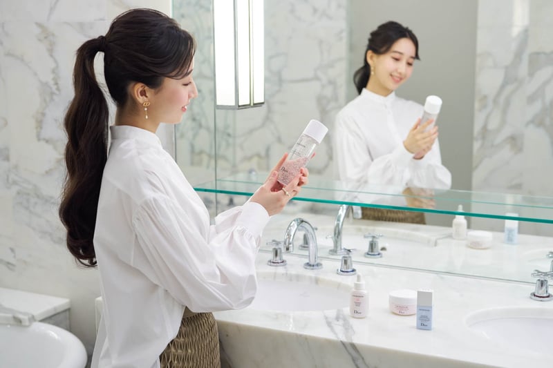 「いつものスキンケアルーティンにディオール スノーは欠かせません。ぬるま湯で洗顔した後、軽くタオルドライしたら、ディオール スノーの化粧水と美容液を塗布しています。フライトや時差などで負担がかかる肌もおかげで調子がとてもいいんです」(Cocomi)。