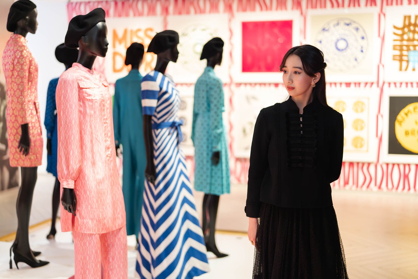 ラ ギャラリーを訪れたCocomiは、13の部屋をそれぞれ観賞。ムッシュ・ディオールや歴代のデザイナーが手掛けたコレクションをじっくり見て周り、「ミス ディオール」にフォーカスした部屋に。ニュールックの誕生と同時に、ムッシュ・ディオールが「ボトルからドレスが一着ずつ現れるように、女性たちを魅惑の香りでドレスアップさせる」ことを願って作り出した、ディオール初の香水 ミス ディオール。現代にも継承される千鳥格子のモチーフが彫刻された初期から、時とともに時代の風をまとって変化していくフレグランスボトルを見つけると、フレグランスとメゾンの結びつきを実感。さらには、Cocomiが表紙を飾った「VOGUE JAPAN」や、アンバサダー就任時に演奏した、1947年にピアニスト アンリ・ソーゲが友人であるムッシュ・ディオールのために作曲した即興円舞曲「MISS DIOR」の未完成楽譜の続きを発見するという、思いがけない巡り合わせも。ディオールの永遠に続くヘリテージを体感する特別なひとときに心をときめかせた。