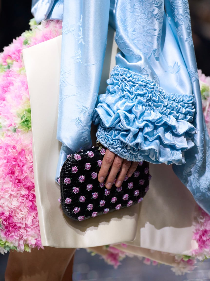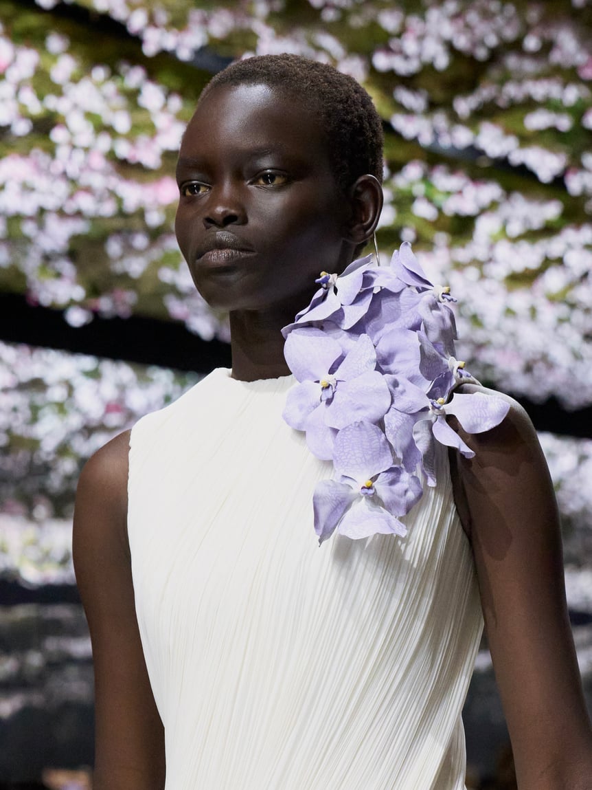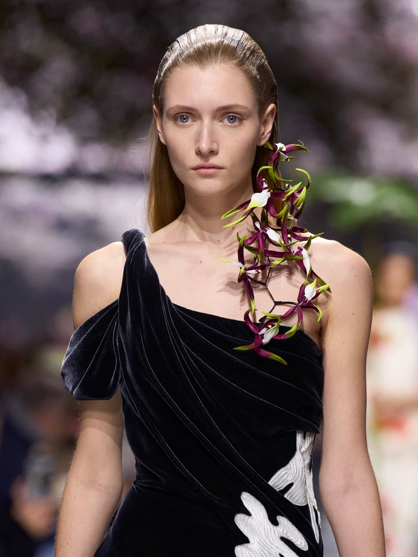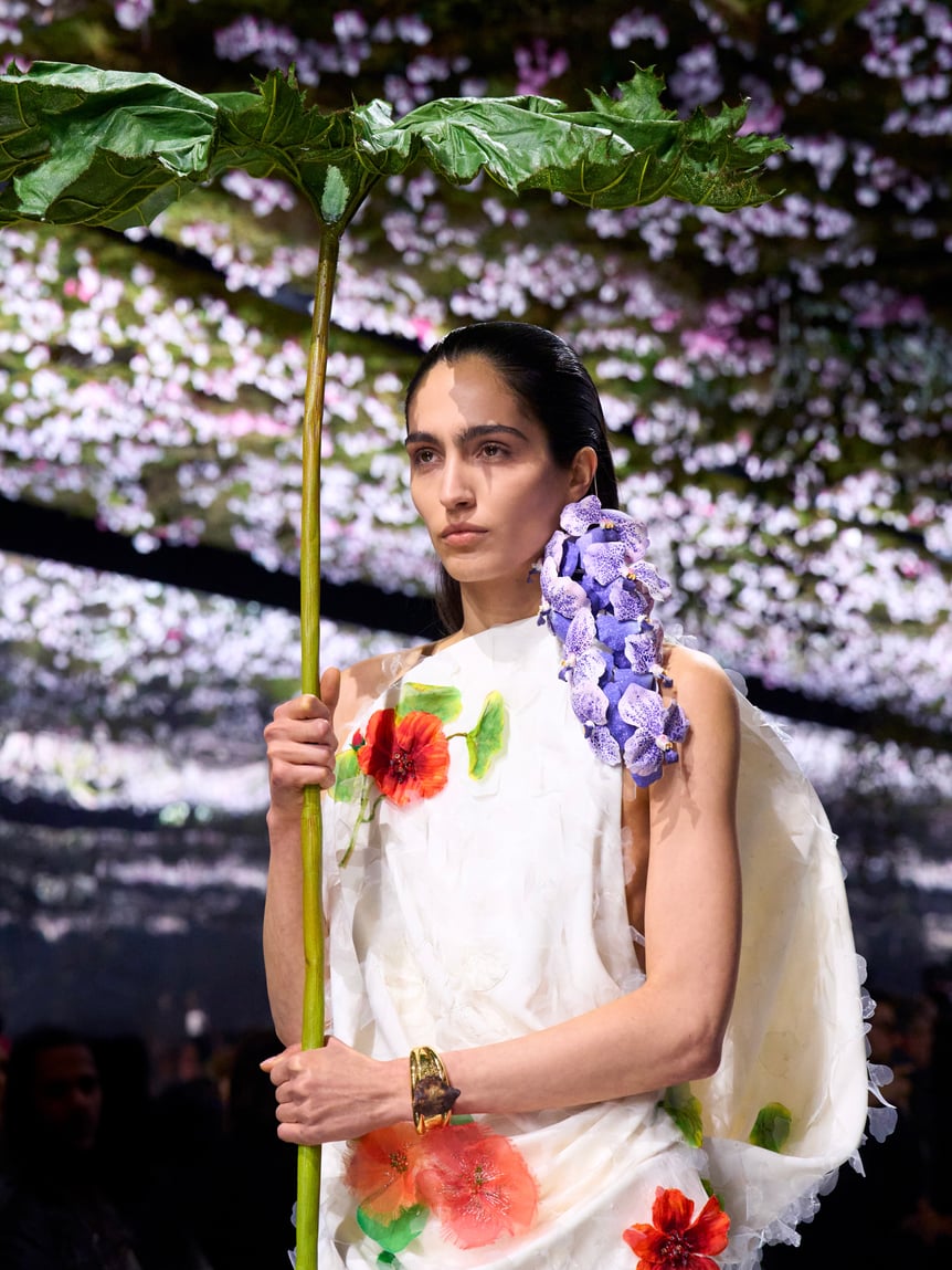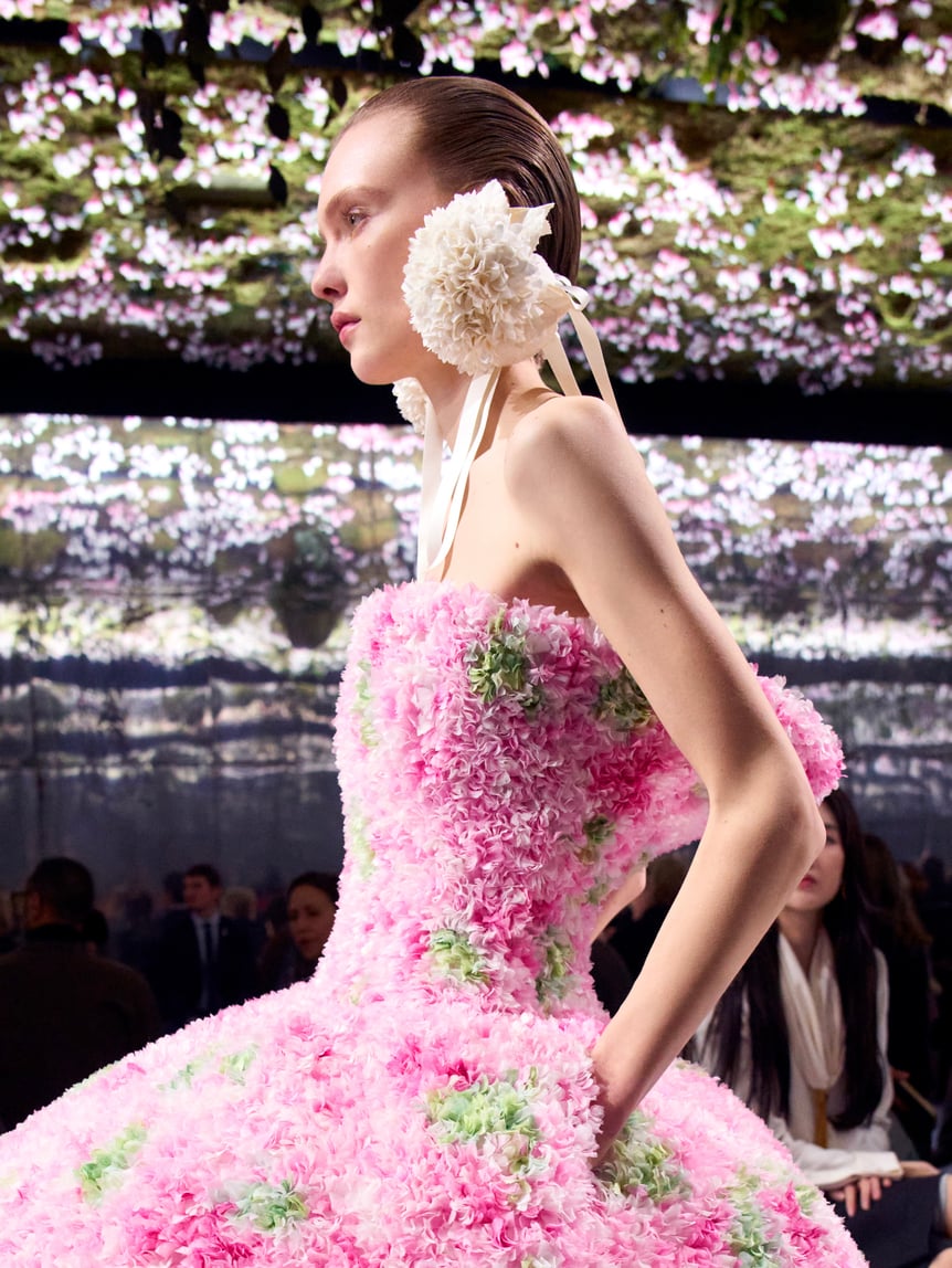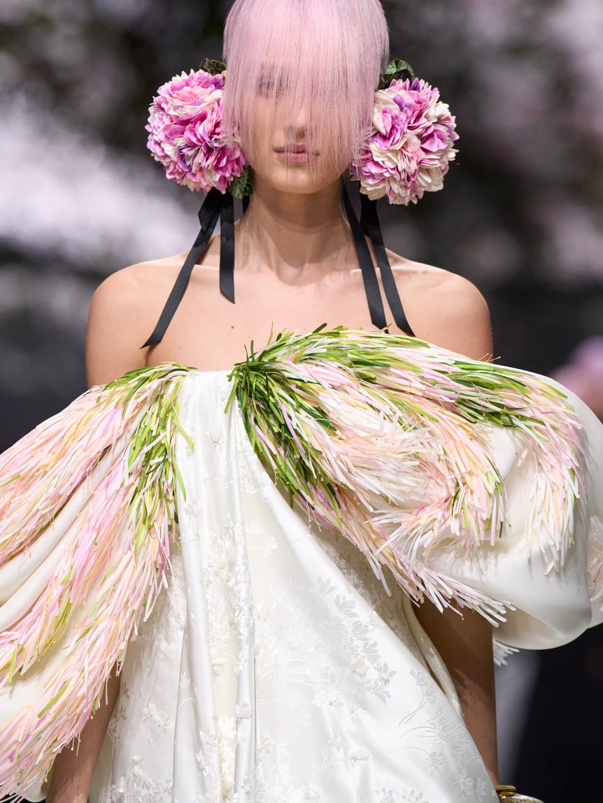 コレクション全体を貫いていたモチーフは花。天然の美しさをクチュールで表現するという、詩的で繊細なアプローチが見てとれた。花そのもののフォルムを模したドレスをはじめ、アクセサリーや装飾として用いられたシルクの花々は、生花と見紛うほど緻密に再現されている。