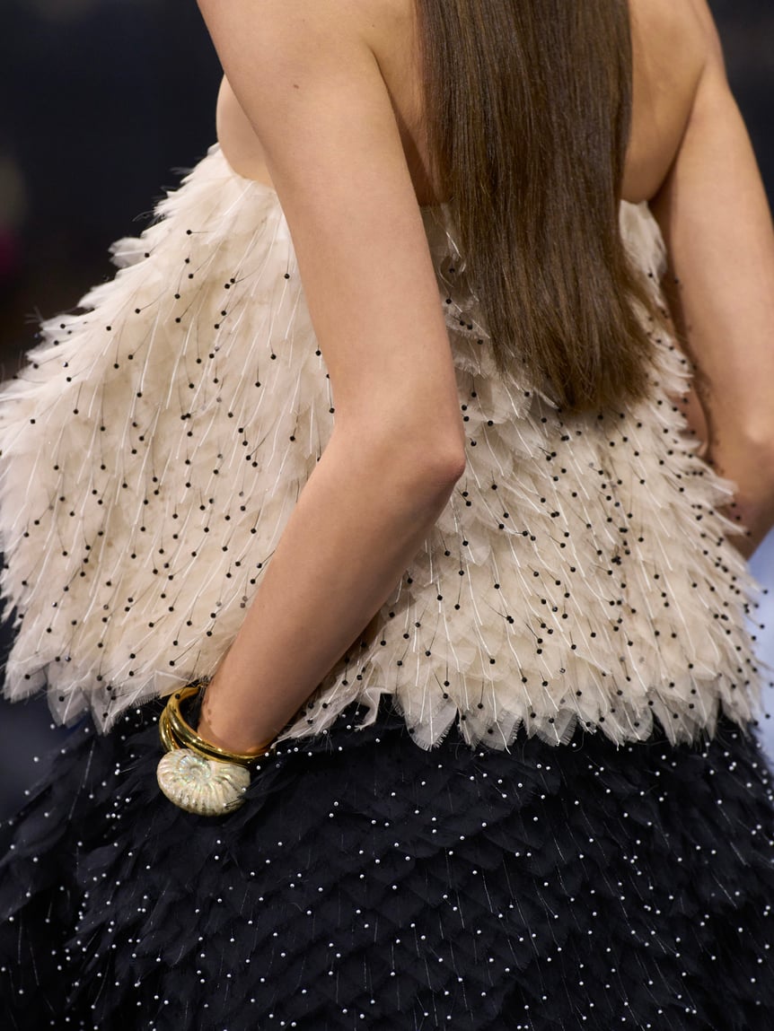風合い豊かな糸を手織りしたネップツイード、鳥籠のようなボリュームのネット、温かみのあるハンドニットなど、革新的な構造とサヴォアフェールがクチュールの言語を拡張。多様なテクスチャーとボタニカルな装飾が調和し、オーガニックな魅力を湛えている。