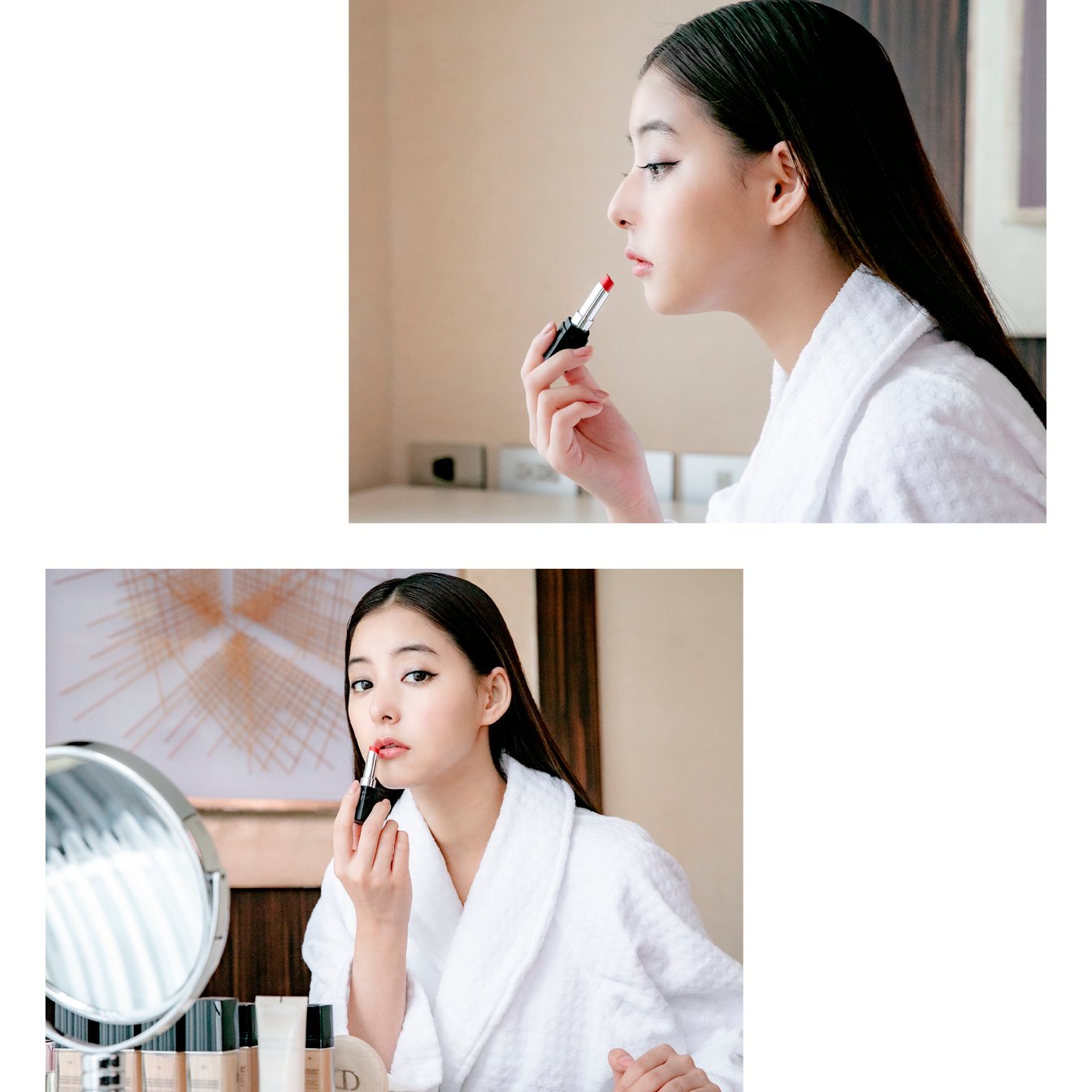 今回は、ジャドール パルファン ドーのエレガントなボトルデザインのように、洗練されたメイクルックに。ベージュゴールドのシェードを丁寧に重ねて、アイラインで凛とした表情を引き立てます。口元は、マスクプルーフ効果とリップケアを同時に叶えてくれる「ルージュ ディオール フォーエヴァー スティック」でドレスアップ。モダンなクチュールフィニッシュの新パッケージで気持ちを高めてくれます。