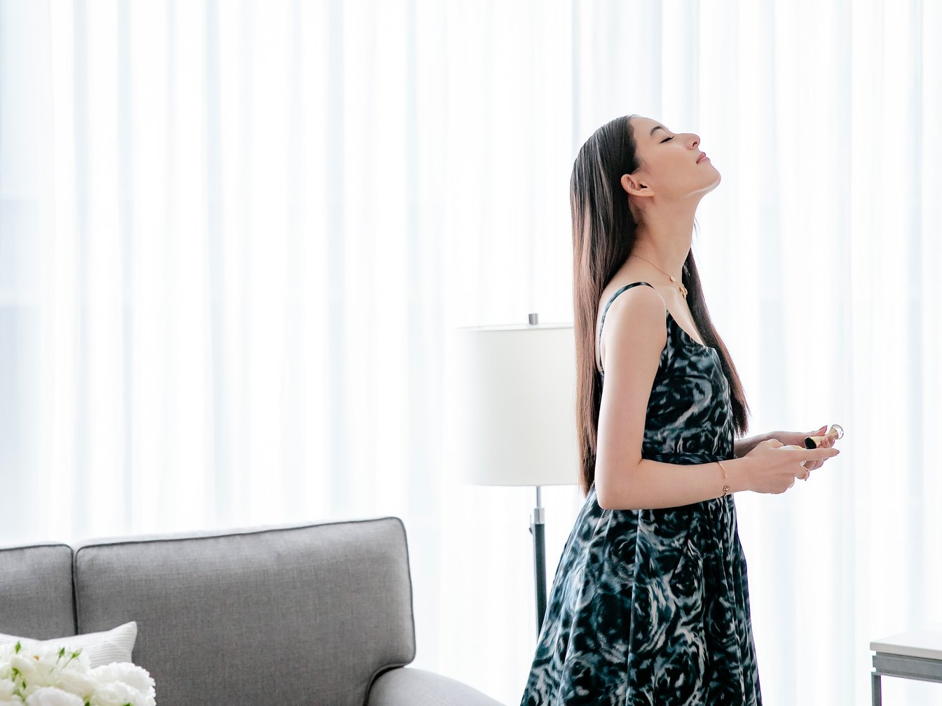 発表会に向けて準備を進める新木さん。準備中もジャドール パルファン ドーを香りながら、気持ちを高めていきます。「お花と水の柔らかな香りなので、空間に数プッシュして使ってみたらとても心地良くて、気に入ってしまいました。特別な日って身支度をする時間もワクワクするので、ぴったりですね」