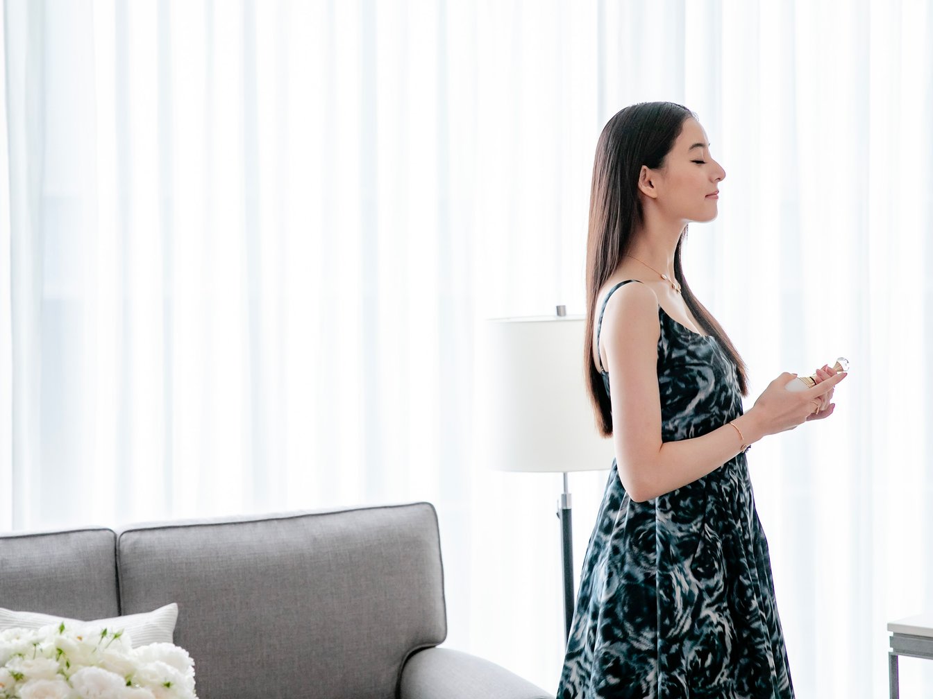 ファッションに合わせて香りを楽しんでいるという新木さん「今日みたいにドレスアップした時にぴったりだと思います。細かくてふわっと心地よいミストなので、肌にじっくりと密着してくれて、グッと華やかな雰囲気になれますよね。反対に、Tシャツとデニムのようなカジュアルなスタイルにも合うだろうなと思ったんです。シンプルな服装でも、この香りをまとったら、エレガントな魅力を兼ね備えた女性ってかっこよくないですか?」と教えてくれました。