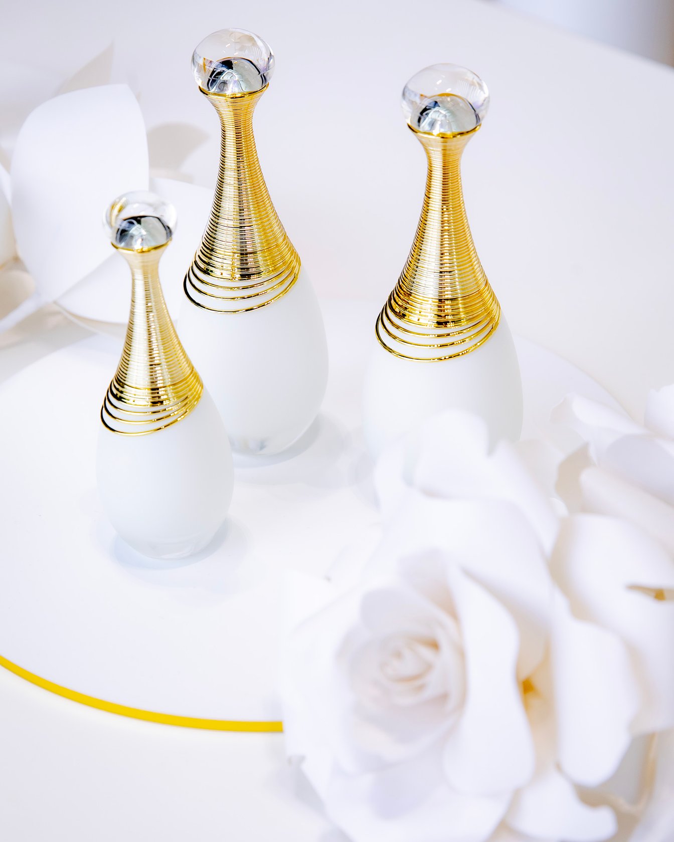 会場内はジャドールらしいホワイトとゴールドのシンプルで美しい配色で彩られ、ジャスミンや、マグノリアといったジャドール パルファン ドーのキーとなった花々を思わせる空間に。
