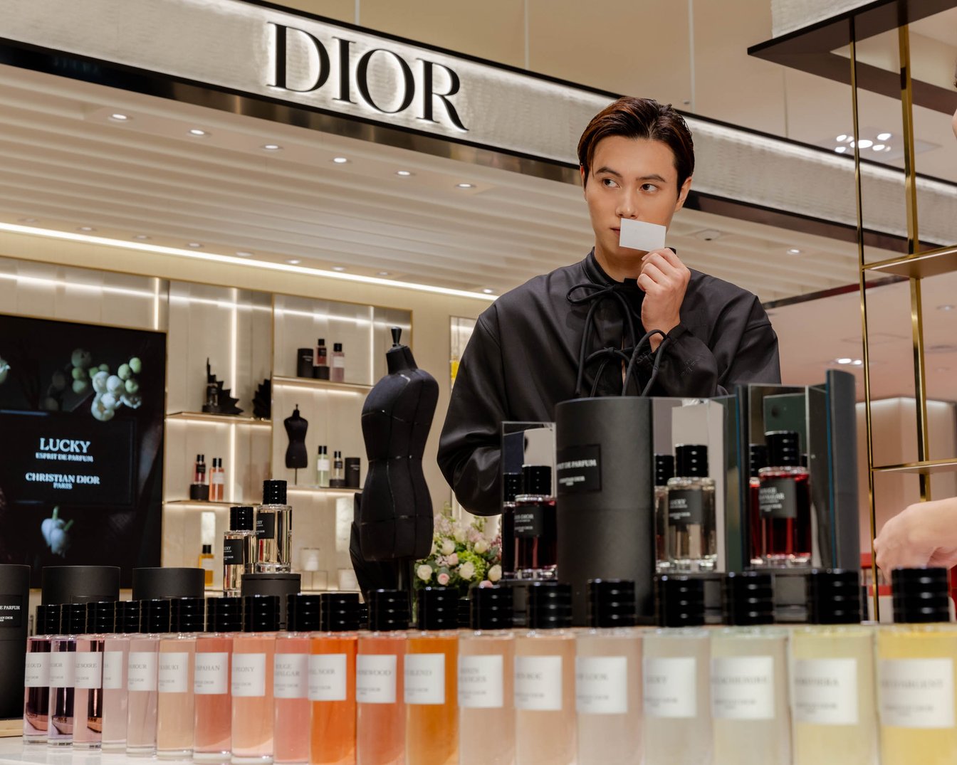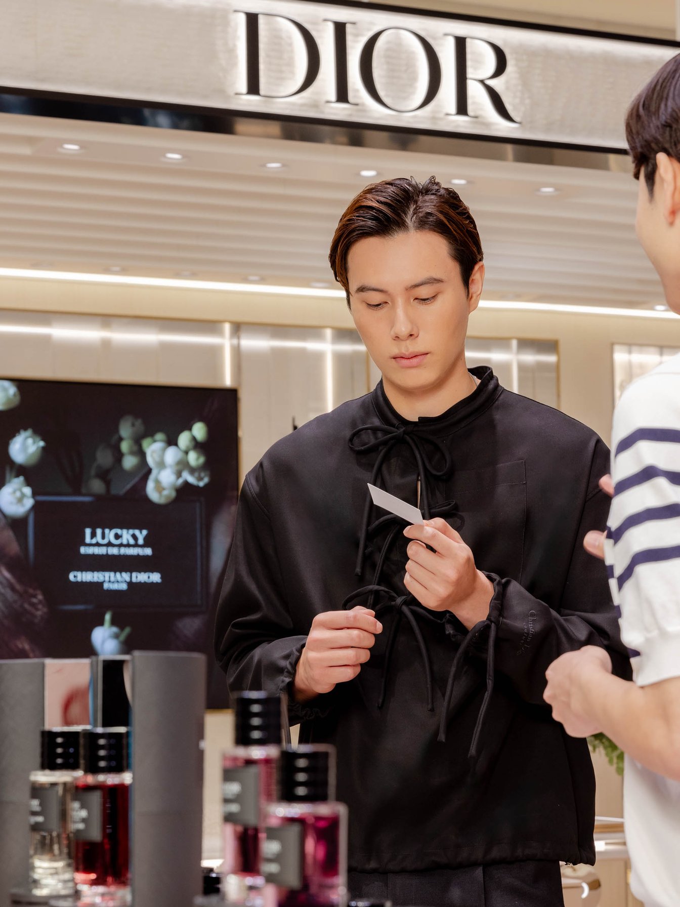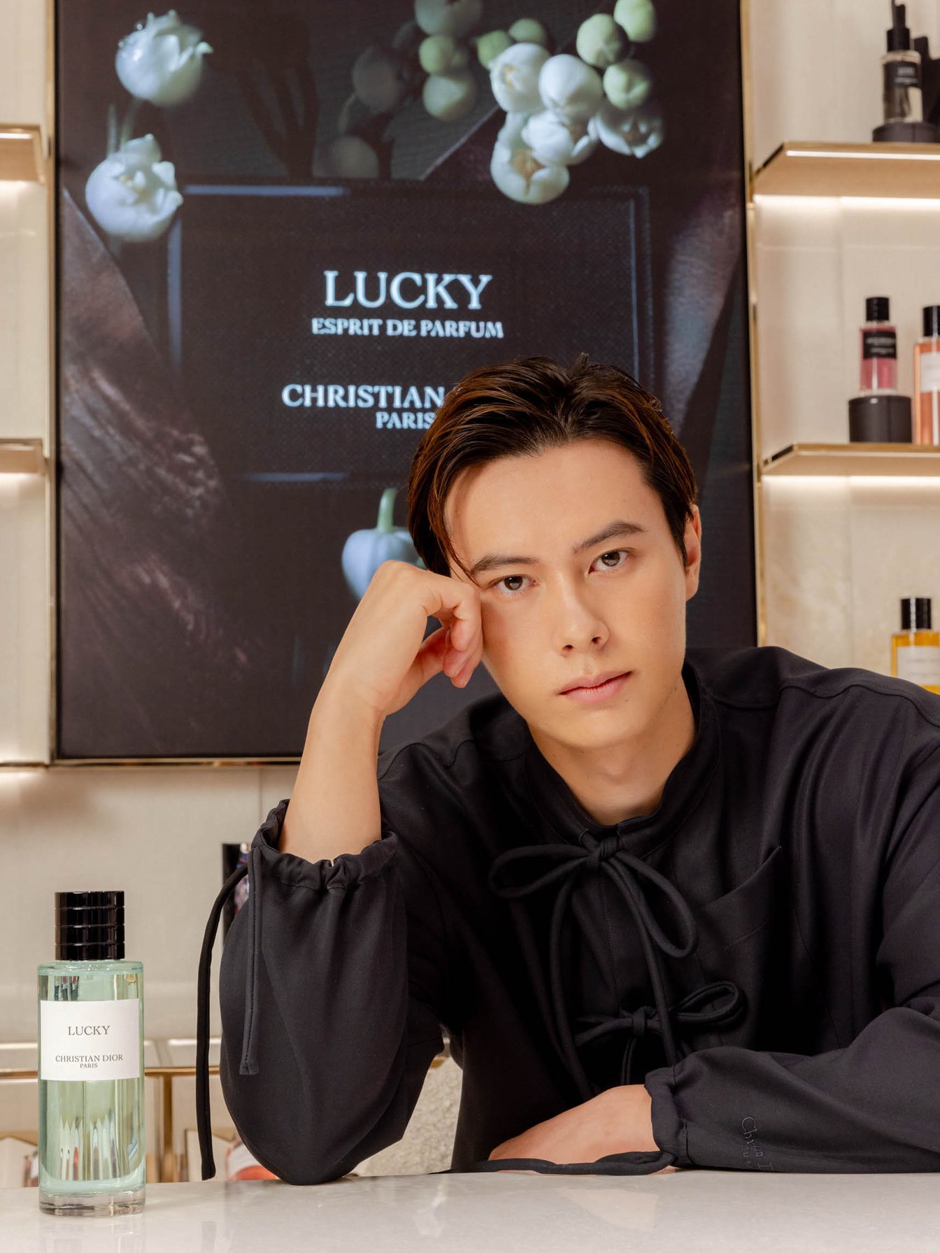 今回初めてフレグランスのスペシャリストから香りの説明を受けた髙橋さん。メゾン クリスチャン ディオールの高貴で洗練された店舗に並べられた、香りごとに異なるカラーのフレグランスを眺めながら、香りに向き合います。「普段はソヴァージュを使っていますが、今回はナチュラルで温かみのある香りを探しています」という髙橋さんにスペシャリストがオススメしたのが、スズランとホワイトフラワーが爽やかな「ラッキー」。グリーン フローラルのラッキーは、クリスチャン・ディオールがショーの成功を祈り、オートクチュール ドレスの裾に縫い込んだスズランや、自身の胸ポケットに忍ばせた一輪のスズランを想起する、まるでディオールの幸運のお守りを表現したかのような香りです。「ライトでとても居心地の良い香りですね。全身に香りをまといたくなります」という髙橋さんの、ラッキーチャームのような存在になりそう。