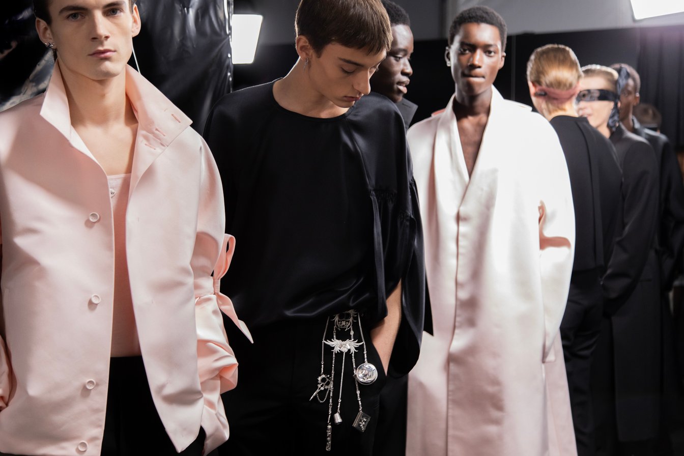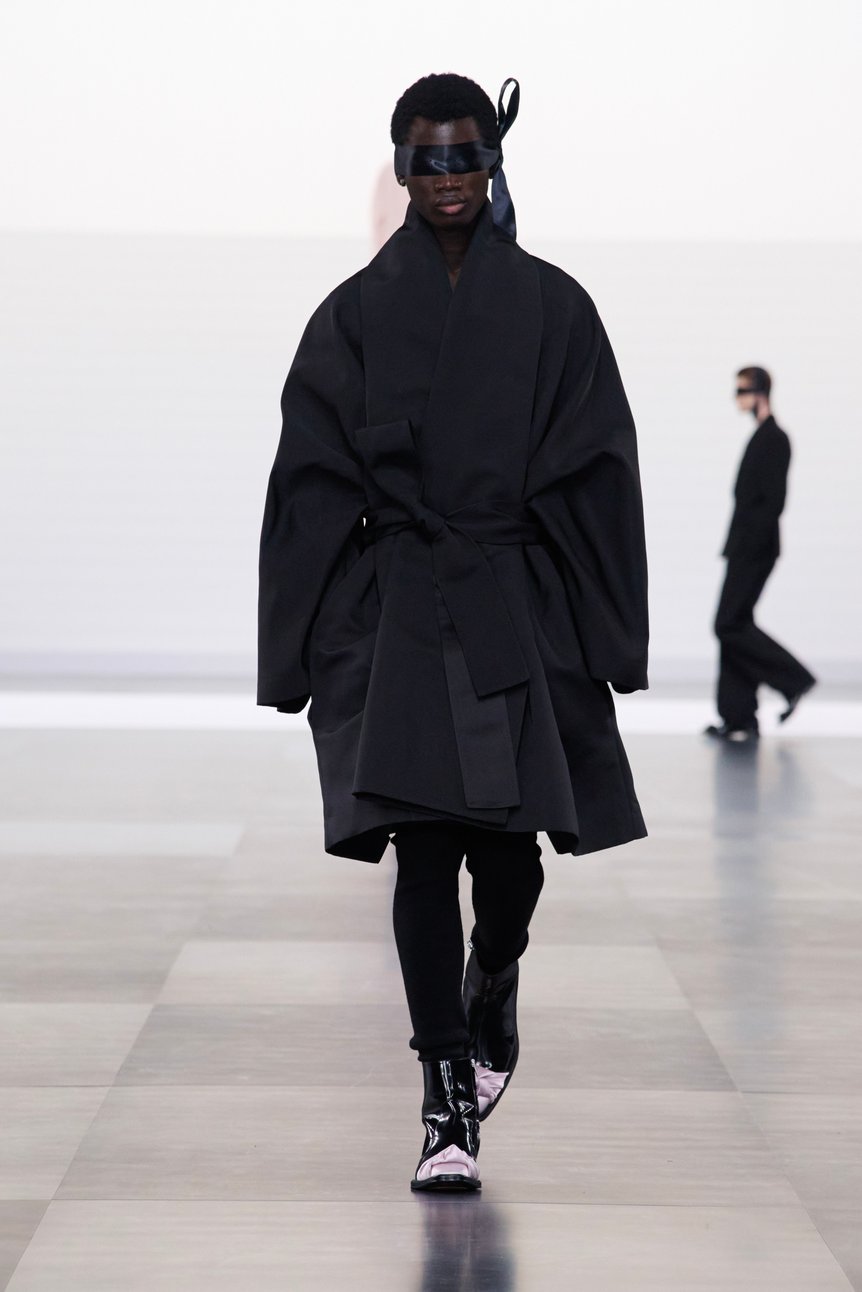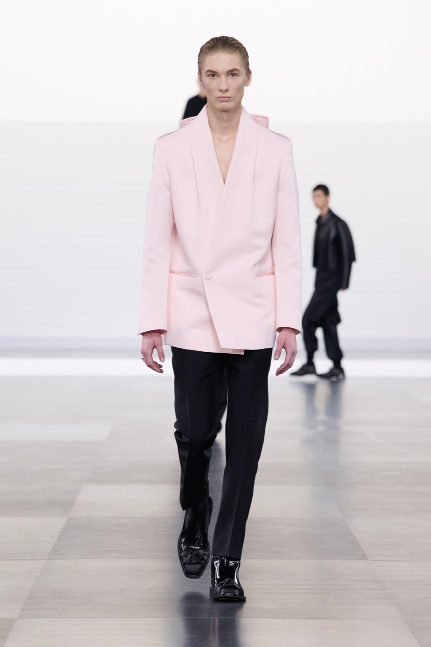 ウィメンズのオートクチュールのアーカイヴを、マスキュリンなメンズウェアに進化させる。あるいは現代的なメンズウェアに、クチュールの要素を注入する。あらゆる時代の文化やテクニックをサンプリングし、深く掘り下げ、現代に向けた軽やかなファッションとして解釈するキムならではの手法が、鮮やかに体現されていた。