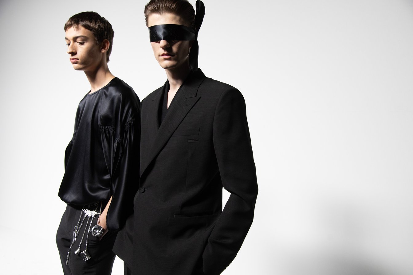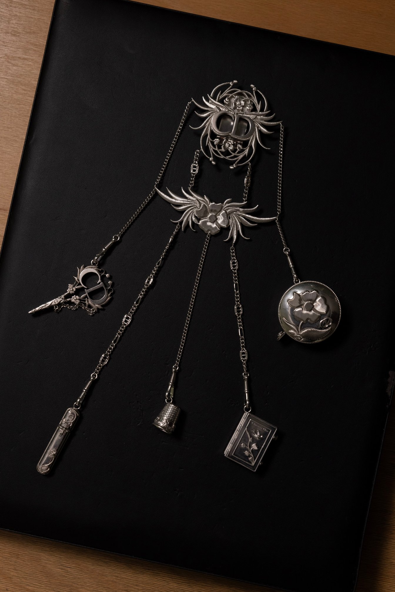 新しい提案として、19世紀ヴィクトリア朝の淑女が愛用していたウエストジュエリーである「シャトレーヌ」を、パンツに付けるメンズアクセサリーとしてアレンジ。シルバー製のブローチから5本のチェーンが垂れ下がり、その先にはボタンボックス、メジャーテープ、シンブル(指ぬき)、ムッシュ・ディオールが所有していたものを再現したという針ホルダー、そしてハサミといった、クチュリエに欠かせない5つの道具がモチーフとなって付けられている。