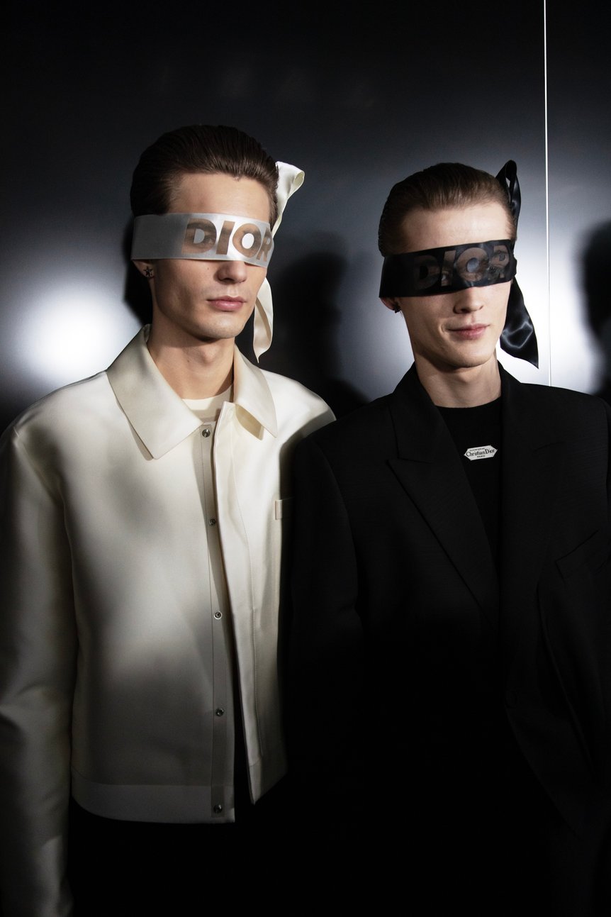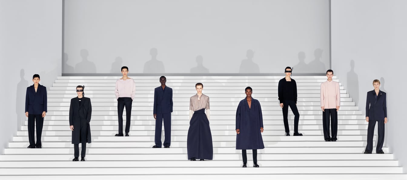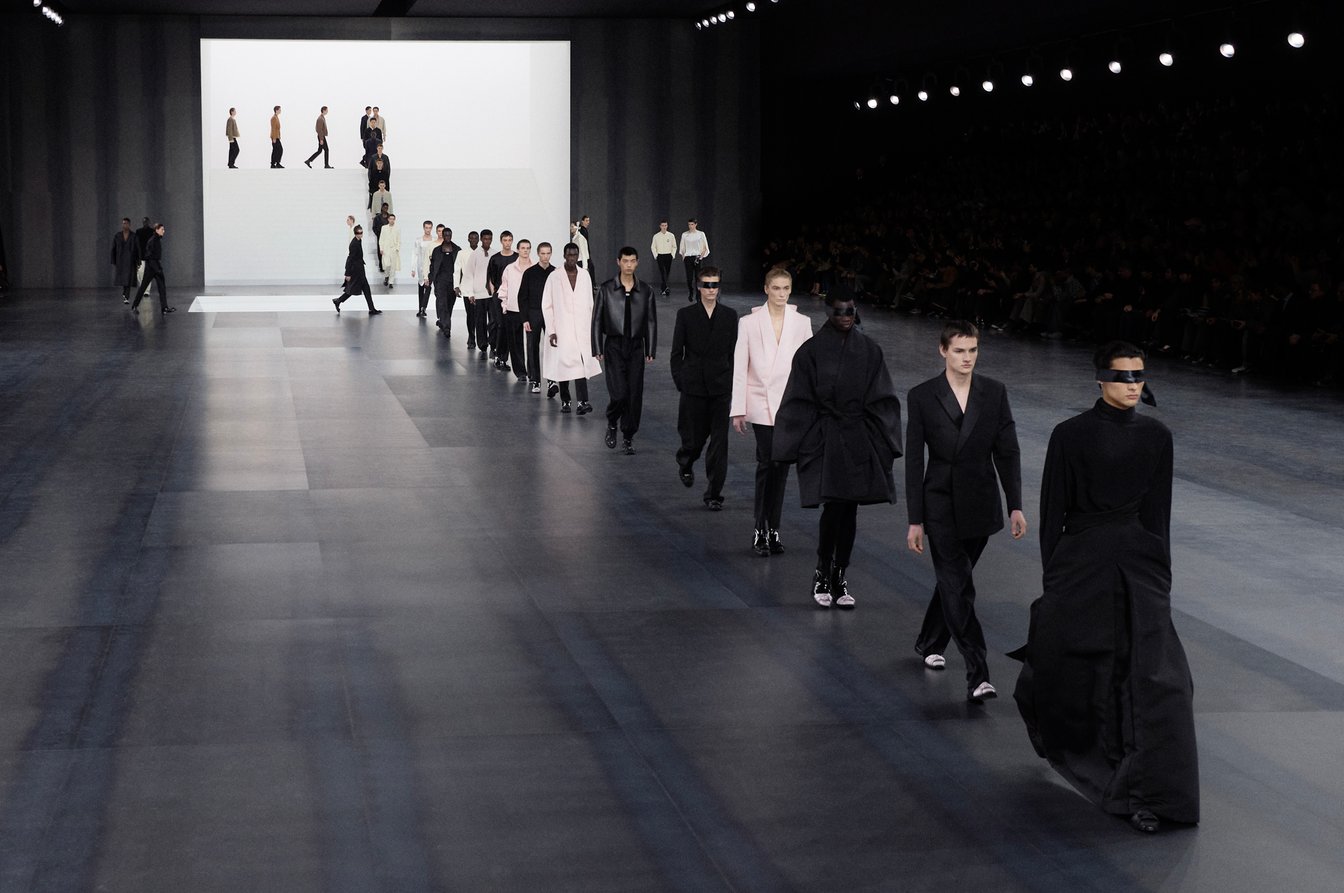ショーの舞台となったのは、パリ7区のエコール・ミリテールに建てられた特設会場。純白の階段が設けられたミニマルな空間デザインで、英国の作曲家マイケル・ナイマンによる「McQueen: Time Lapse」(映画「マックイーン」の楽曲)の荘厳なサウンドがショーを演出した。メンズウェアの既成概念を揺るがし、贅沢さとシンプルさ、エレガンスと実用性を兼ね備えたキムの真骨頂とも言える美しいメンズクチュールの数々に、フィナーレは大きな拍手に包まれた。
