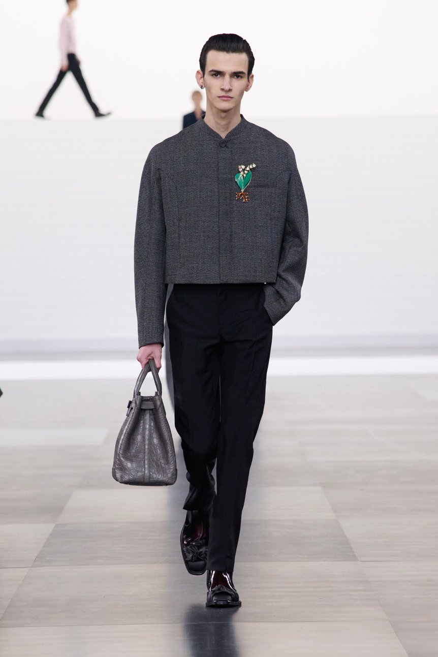 オーセンティックなテーラードジャケットやスーツは、ディオール オム時代を彷彿とさせるミニマルでソリッドなシルエット。片側だけショート丈を組み合わせた二重仕立てのロングジャケットなど、キム流のアレンジが効いている。一方でショート丈のジャケットは、やや丸みのあるフォルムでエレガントなブローチを合わせた。