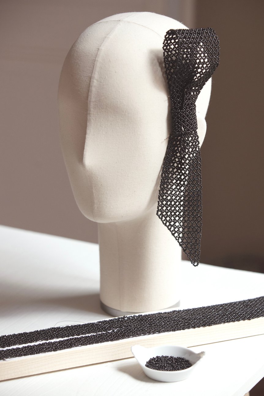 ミステリアスなムードを醸し出したリボンのアイマスクは、帽子デザイナーのスティーブン・ジョーンズ(Stephen Jones)がデザイン。リボンもムッシュが好んだモチーフのひとつで、細かいビーズを織り込んだデザインも制作された。
