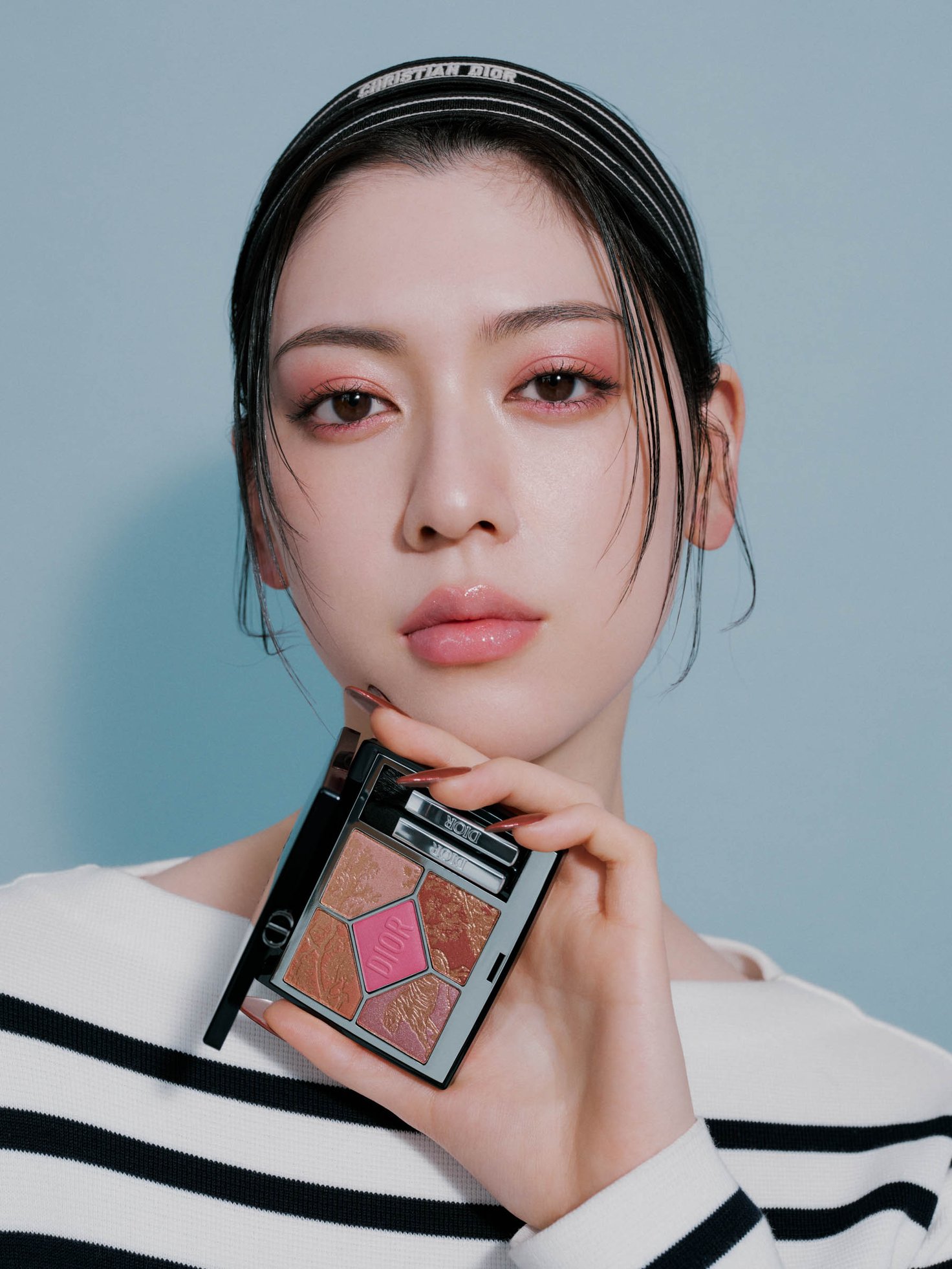 スターアイテムのアイシャドウパレット「ディオールショウ サンク クルール 974 ピンク リビエラ」を使用。5色すべてにピンクが含まれ、じんわりうるんだような目元も、ヴィヴィッドピンクを効かせたプレイフルなメイクも、あるいはその両方を取り入れても、なじみは抜群。くすまずフィットし、煌めきを放つピンクのハーモニーが、腫れぼったさとは無縁の澄んだまなざしを輝かせる。