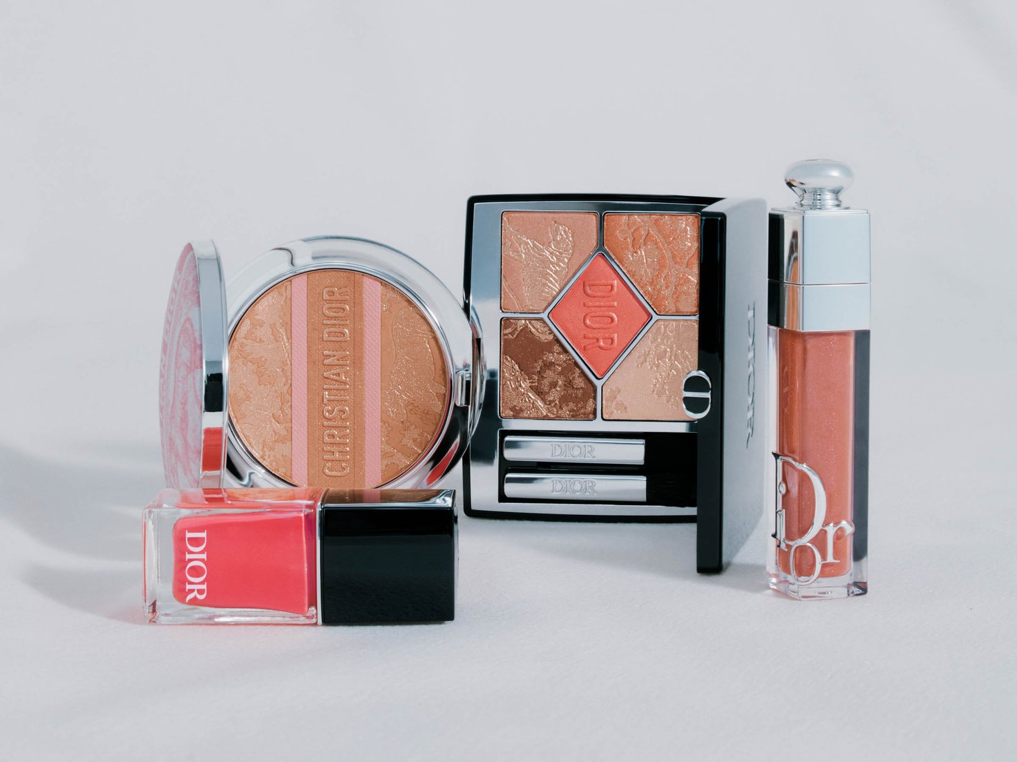 左手前から「ディオール ヴェルニ 330」(4620円)/「ディオールスキン フォーエヴァー ヌード ブロンズ グロウ」(8580円、ディオール 公式オンライン数量限定品)/「ディオールショウ サンク クルール 654」(1万10円)/「ディオール アディクト リップ マキシマイザー 090」(4730円)※4月25日限定発売