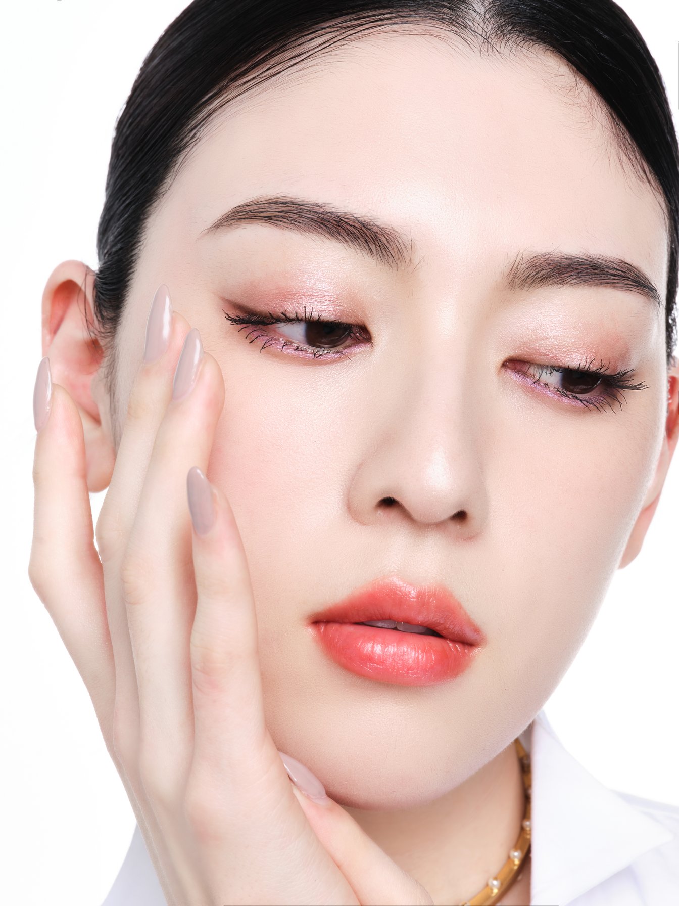 STEP1:モノ クルール 755 ローズ チュールをアイホール全体および、下まぶたに少し幅広く乗せる。次に、045 セレスティアル グレーを上まぶたの黒目の真上になじませるように乗せる。
