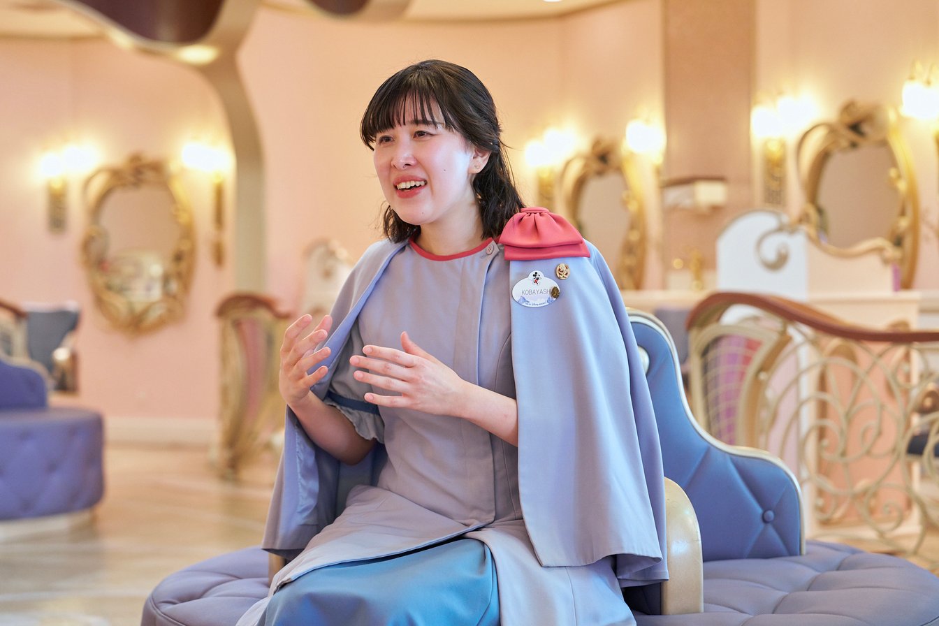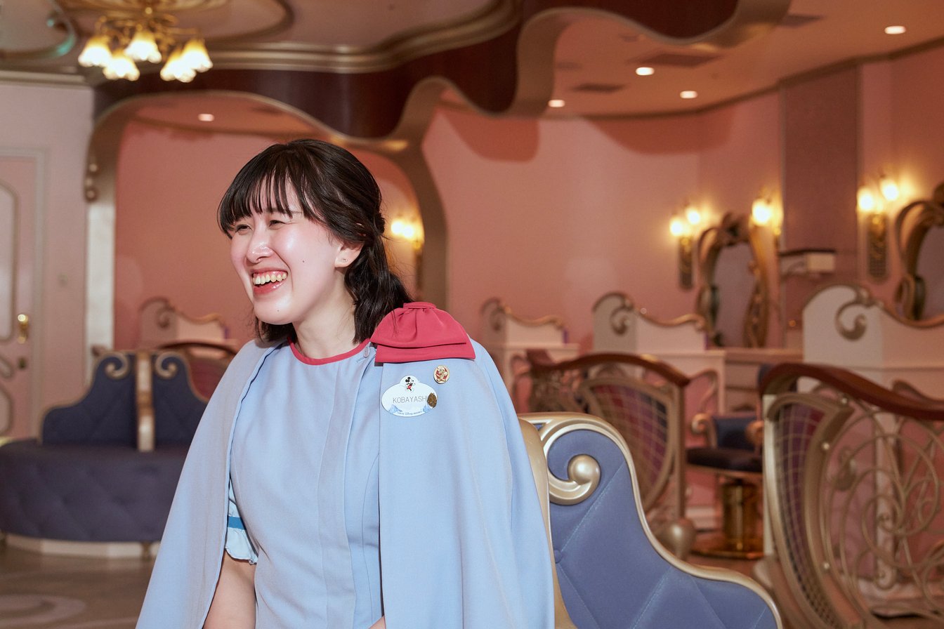 東京ディズニーリゾートのヘアアンドメイクアップキャスト。高校生の頃に同職を志し、美容専門学校へ進学。美容師資格を取得後、美容室で経験を積んだのち、2017年から同ブティックに従事。"ディズニープリンセスになる"という体験を通して、訪れるゲストに唯一無二の価値を提供する。