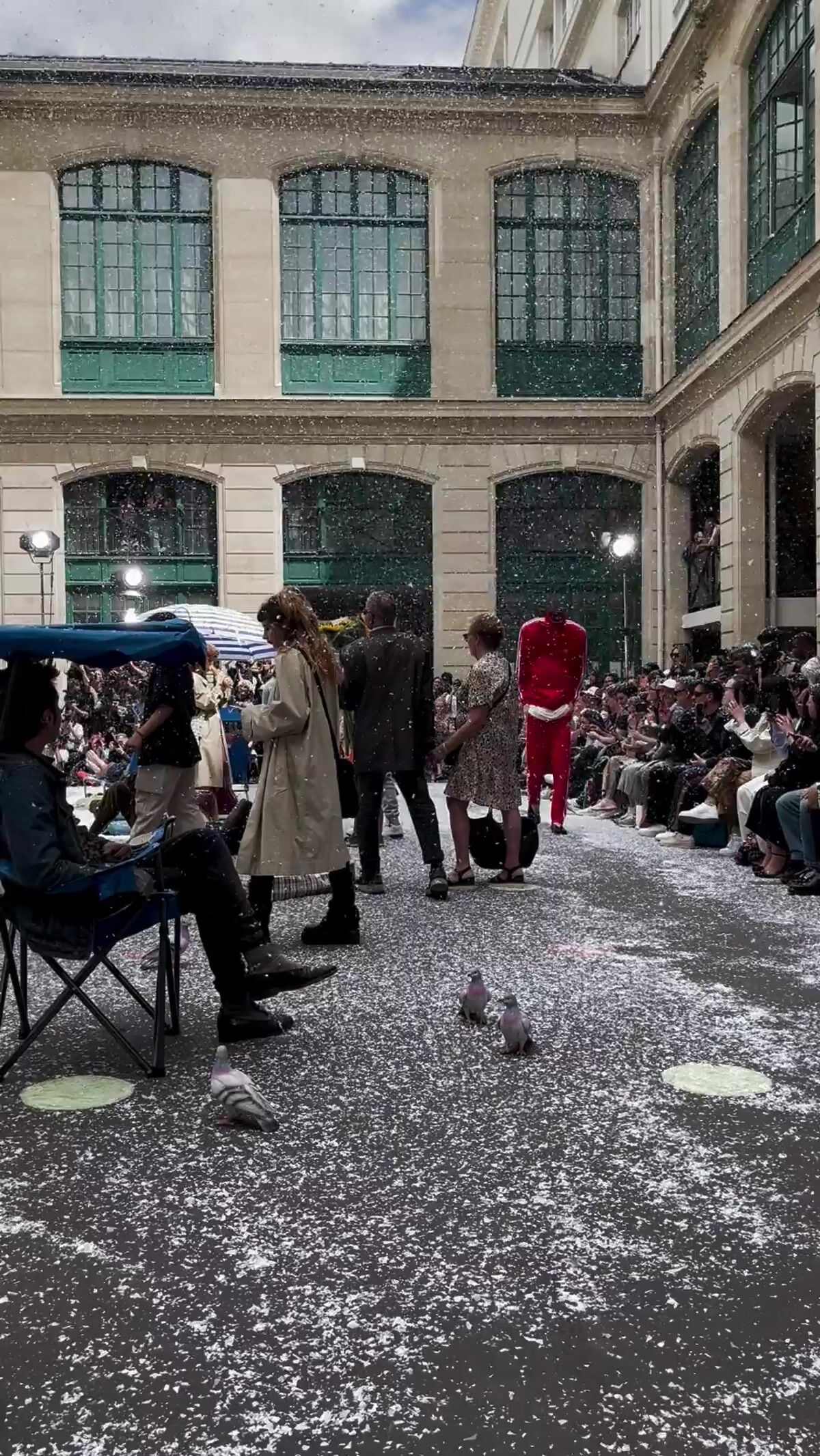 ダブレットにとってパリは、2020年1月に「ファミレス」をテーマに発表した2020-21年秋冬コレクション以来。パンデミックにより約2年半にわたって渡航が断念されたが、井野はパリに戻ることを考え続けていたという。現地でショーをやるならば「体感してもらえるショーを」という考えで、愛読する小説の一説をなぞり「夏のパリに雪を降らせる」ことを発案。過去にも常夏のシンガポールで雪の演出を行ったことがあり、雪を見たことがない子どもたちが喜んでくれたという経験が活きた。