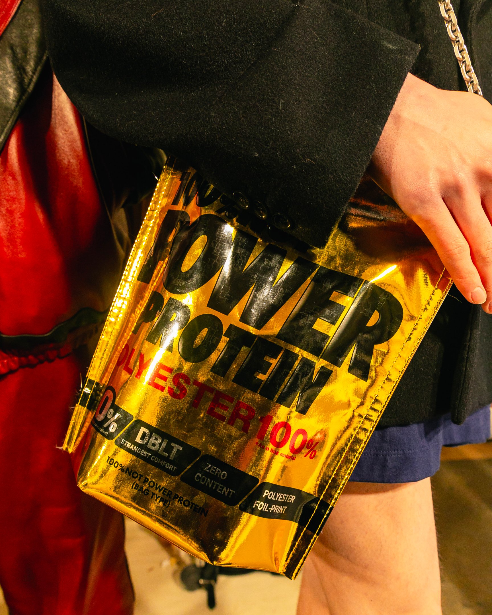 だが、“THE CURE”のテーマ通り、ソンビたちの心身ケアも忘れない。「ユニクロ(UNIQLO)」の「ヒートテック」ならぬ“HEAL TECH”の文字があしらわらたスウェット、「ギャップ(GAP)」を想起させる“NAP(昼寝)”ロゴフーディー、磁気でコリをほぐす「コラントッテ(Colantotte)」とコラボレーションしたTシャツやアクセサリー、プロテインやヨガマット風のバッグ、サウナ好きとして知られる井野デザイナーらしい温泉マークをモチーフとしたロゴなど、ユーモア溢れるデザインが登場。それでも他シーズンと比べて遊び心は控えめで、アイテム自体はシンプルにまとまっている印象だ。