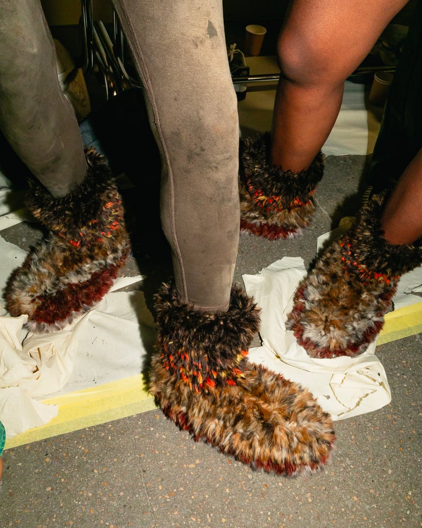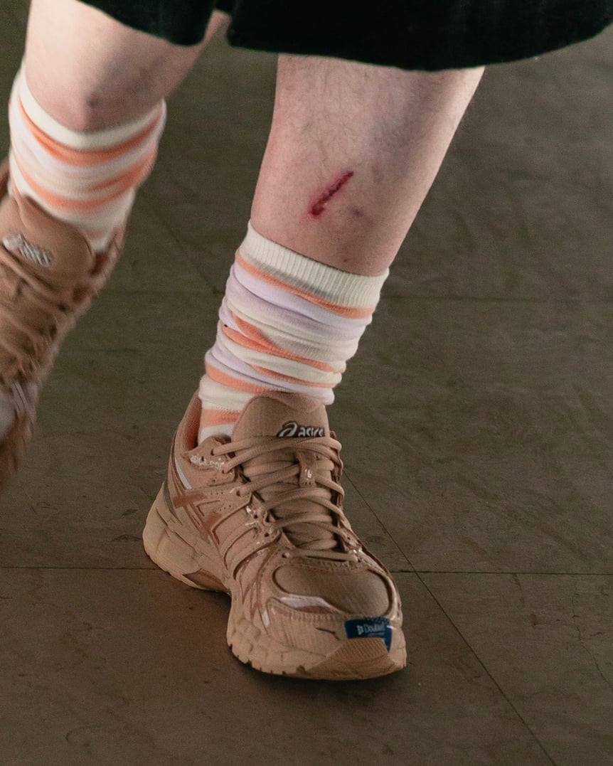 足元は、スタッズ付き健康サンダルやファーブーツといったインパクトの強いフットウェアと共に、「アシックス(asics)」との初コラボとなるスニーカーも披露された。