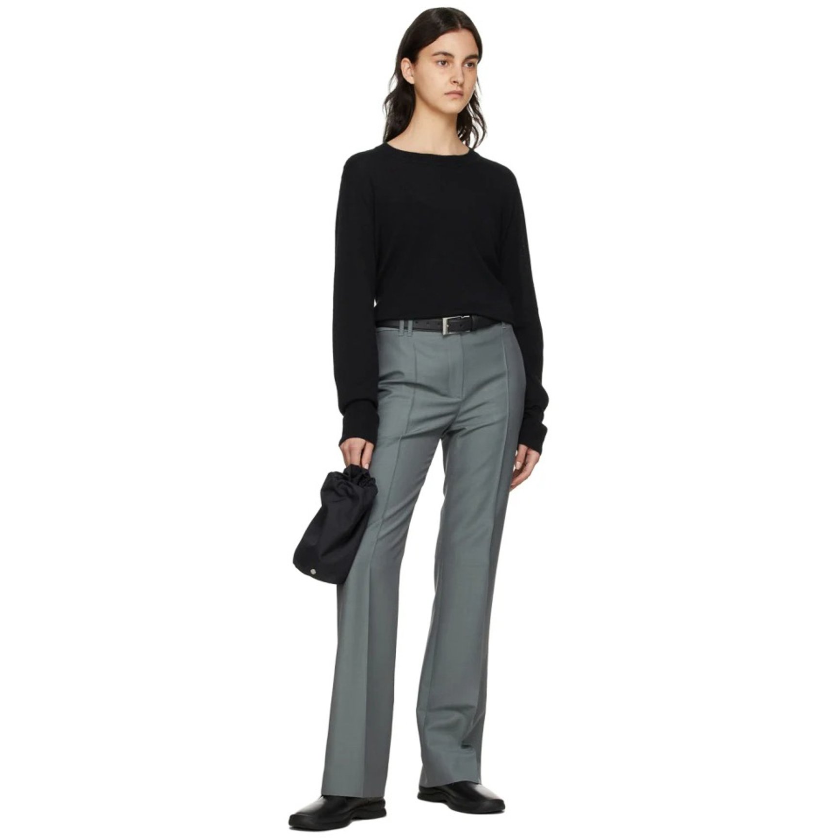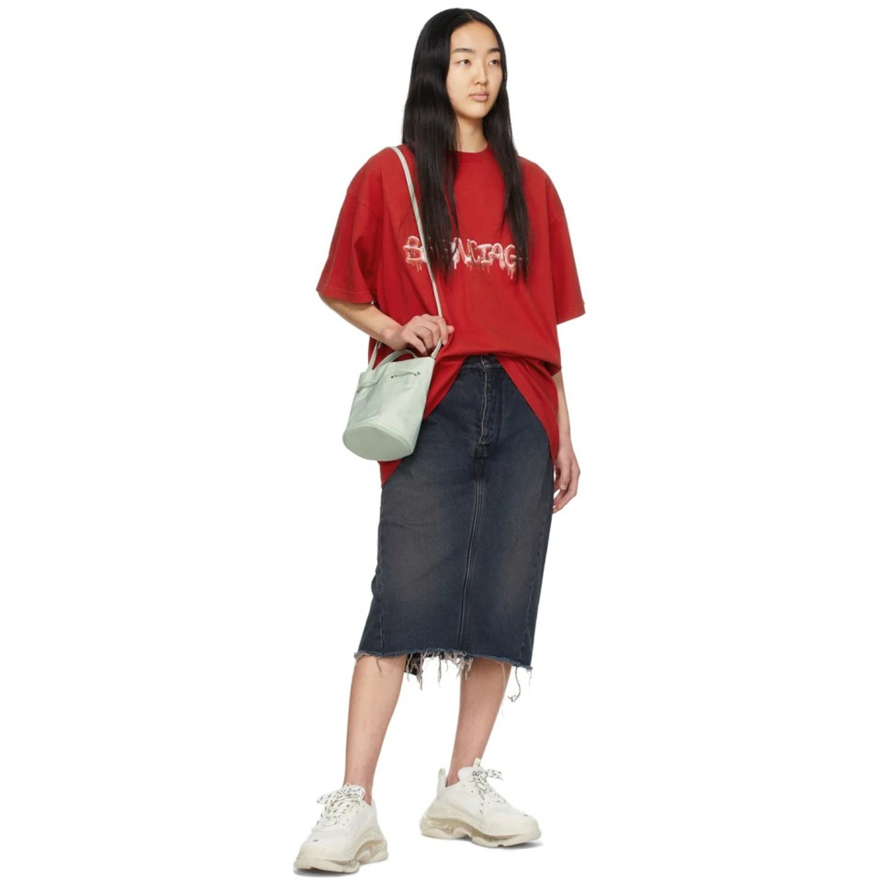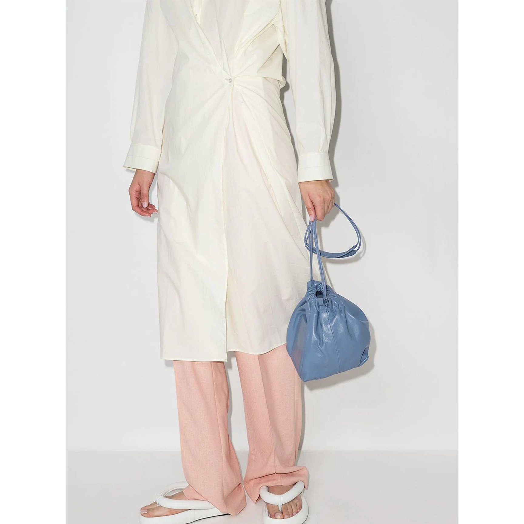 フロントにさりげなくロゴをエンボス加工で施し、丸みを帯びたミニマルなフォルムのバッグは「ジル サンダー(JIL SANDER)」のもの。涼しげなブルーのカラーがコーディネートに彩りを加えてくれます。