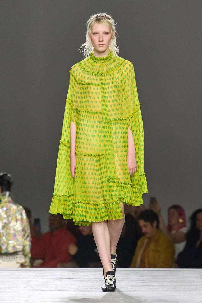 冒頭のルックから、観客は徐々に高まっていく色彩のハーモニーに誘われる。ミュートされた色調と繊細なシルエットで始まるコレクションは、次第に鮮やかさと大胆さを増していく構成となっており、まるで夕暮れから夜明けへと移り変わる空の様相を彷彿とさせた。クロスナー自身が述べる「ゆっくりとクレッシェンドを構築し、鮮やかで大胆な表現で終わらせたかった」という意図が反映されたものだ。