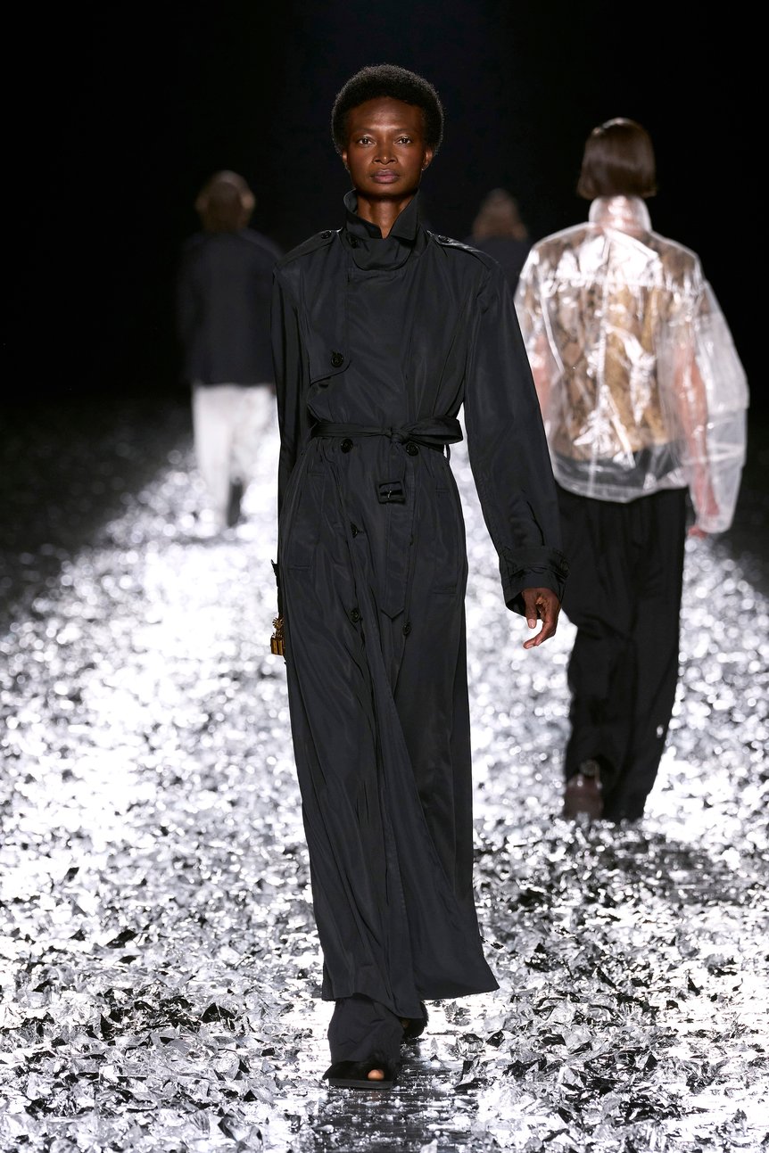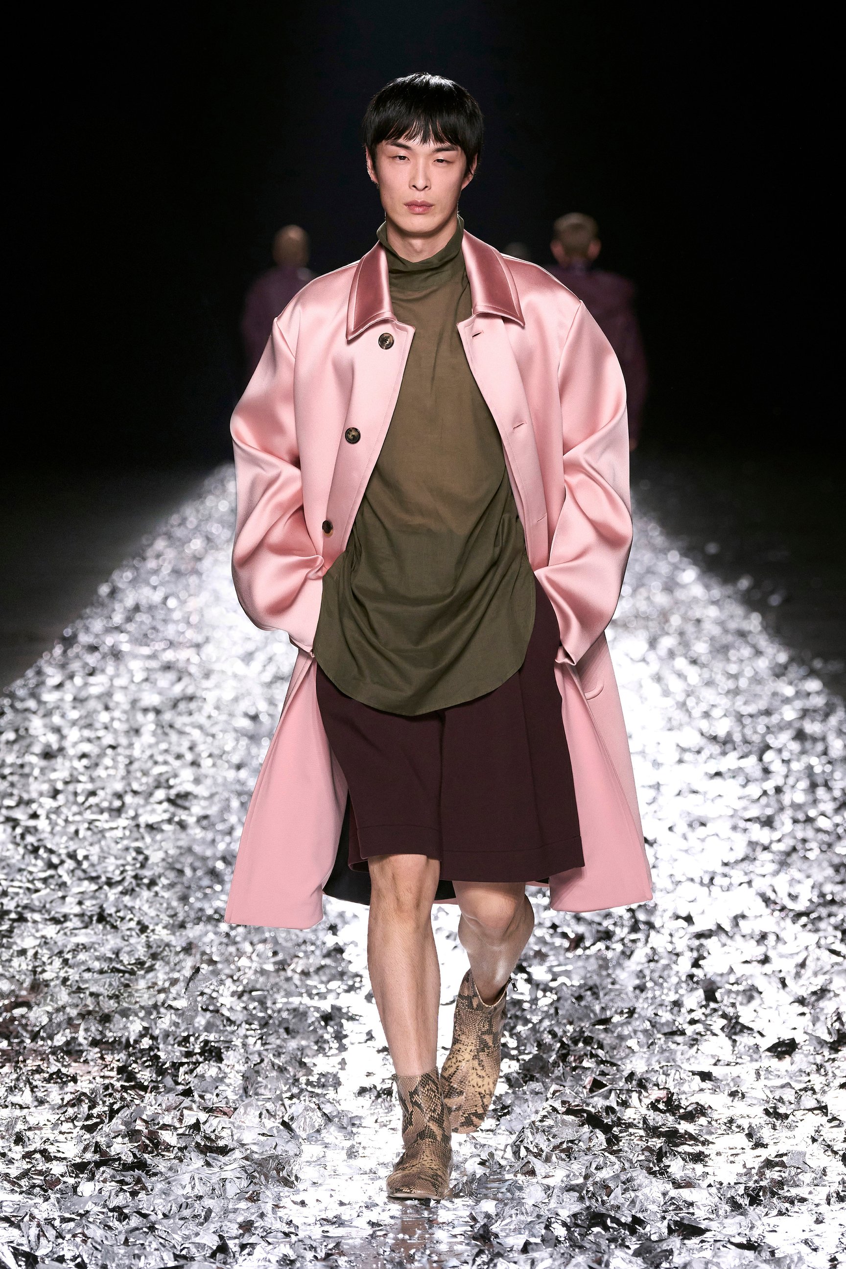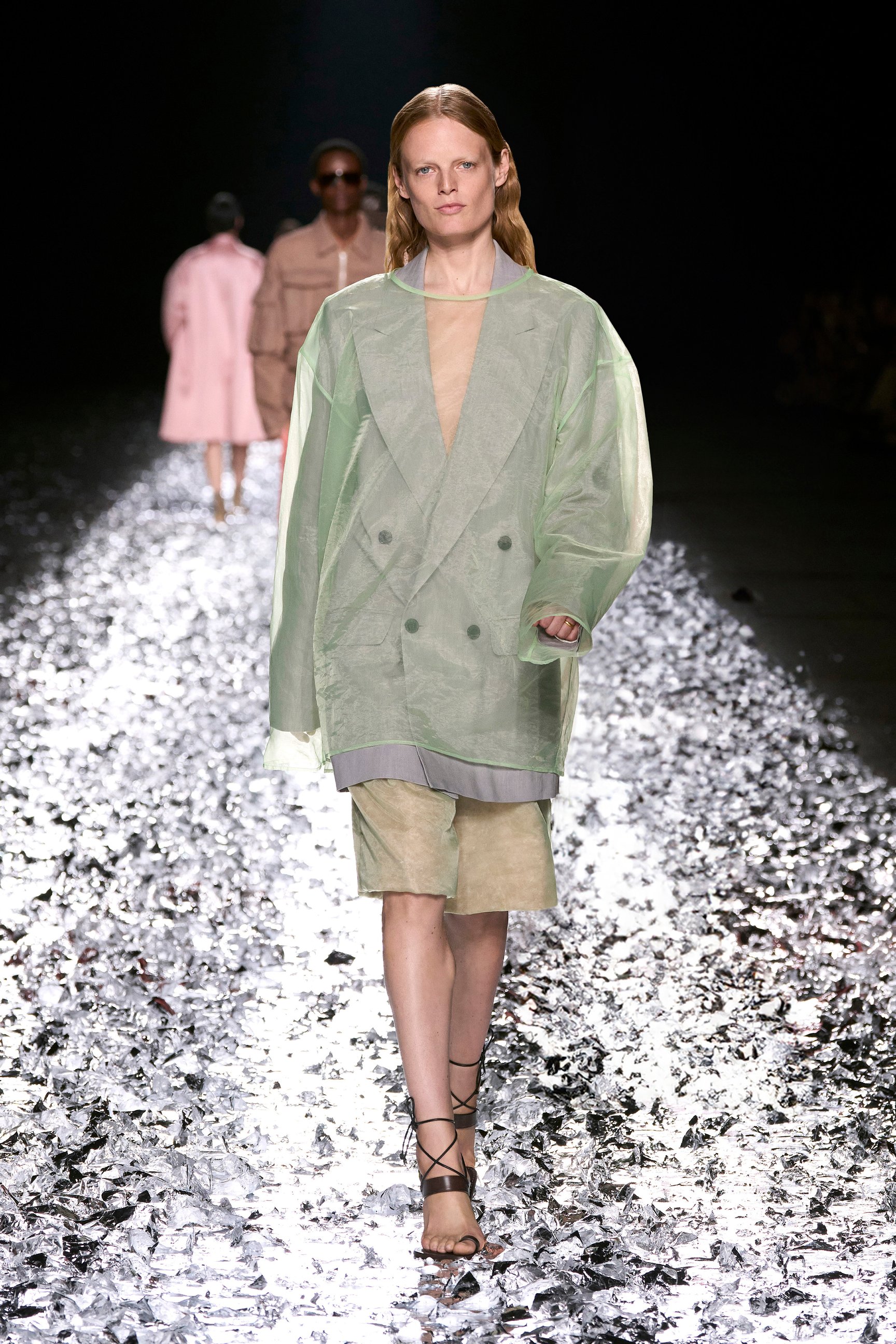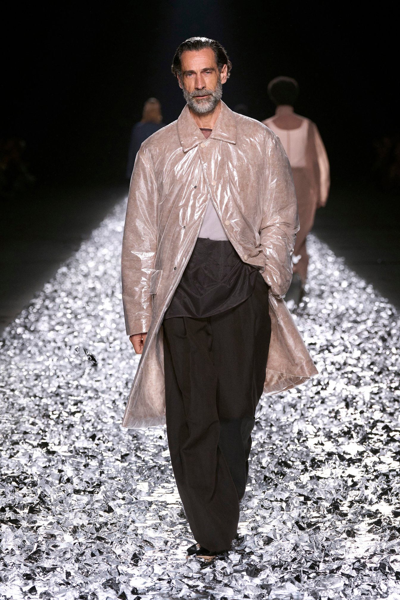 「素材は感情を伝えるもの」とドリスは言う。ベルギーの現代アーティスト、エディス・デキント(Edith Dekyndt)の作品からインスピレーションを得ており、たとえばクリアな生地の中に見える中綿はリサイクル・カシミアだそうだ。透けるオーガンザは、クラシックなブリティッシュウール生地で仕立てられたジャケットと合わせられるなど、細長いシルエットを中心に、素材、色彩、質感のコントラストを効かせ、偶発性を楽しみながらシャープなスタイリングは健在。ウィメンズモデルは多数登場したが、彼女たちがまとっているのはメンズ服だ。メンズウェアから始まったドリスは、メンズコレクションで締めるのがふさわしい。そして、ドリスはジェンダーの固定概念にとらわれるデザイナーではない。