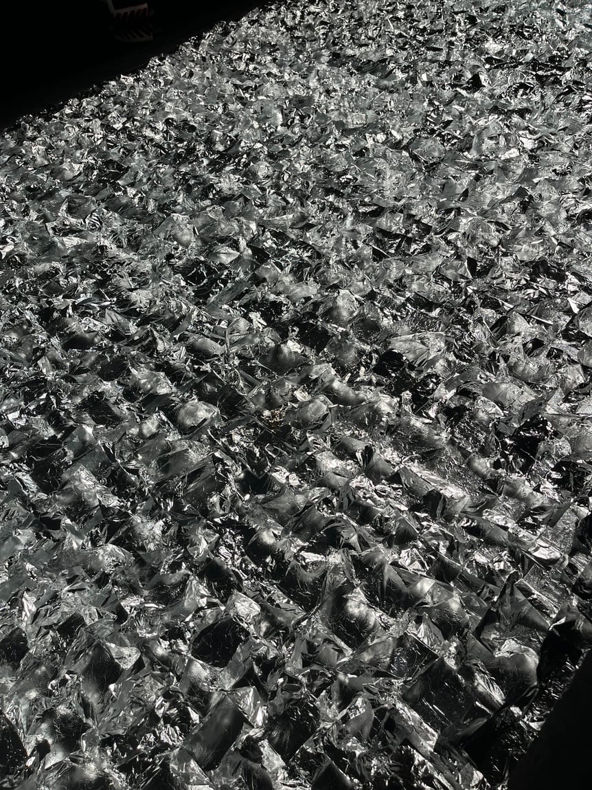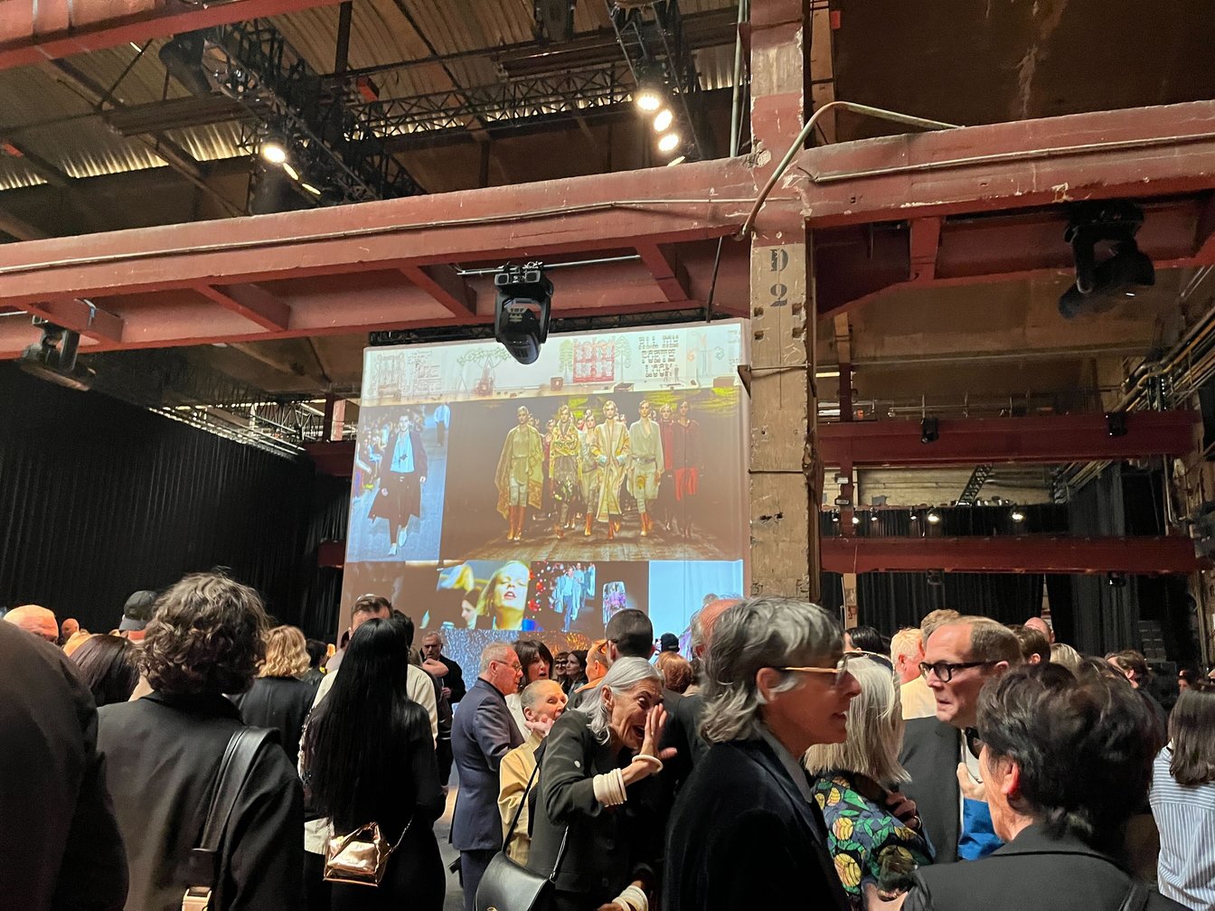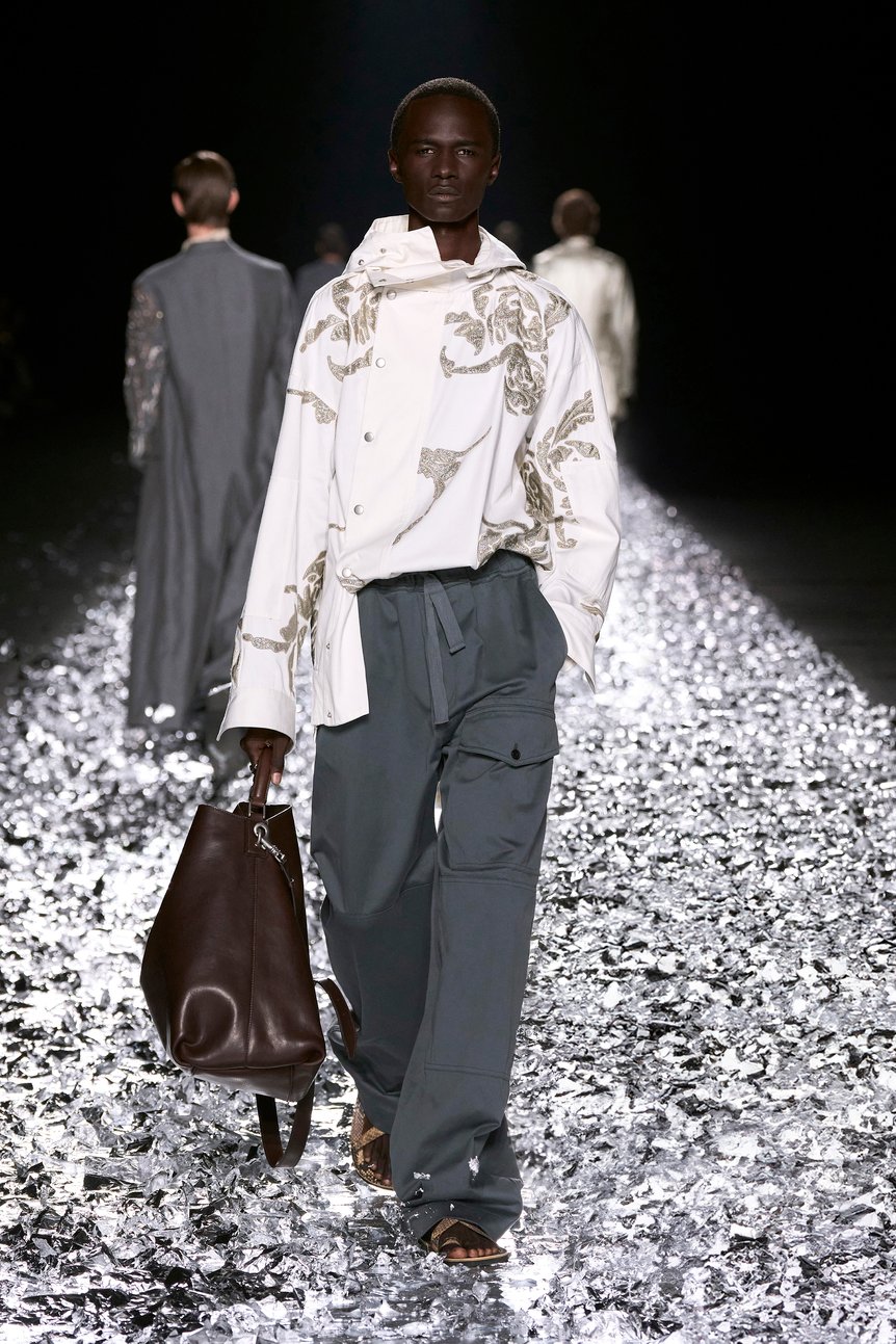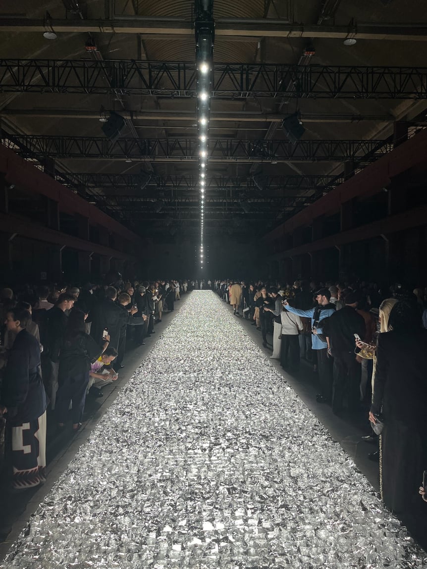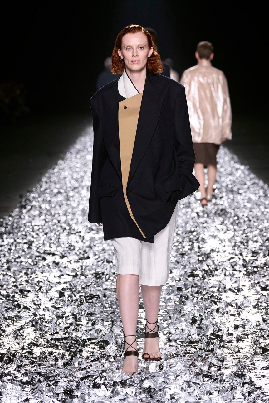 会場はパリ郊外の巨大な倉庫で、ショーの前には来場者をカクテルパーティーでもてなした。広告のためのポップスターが招かれることはなく、来場者の多くは、自前の「ドリス」を自己流に着こなしてショーに参加。中央の巨大スクリーンには過去のコレクションの映像が映し出され、誰もがさまざまな物思いにふけっていたことだろう。ショー開始の時間が近づくと、巨大な空間を仕切るカーテンが開かれ、ランウェイスペースが姿を現した。そこに照らされていたのは、一筋の銀色の道だ。よく見ると、道の上には銀箔が、会場の熱気の中でひらひらと揺れている。