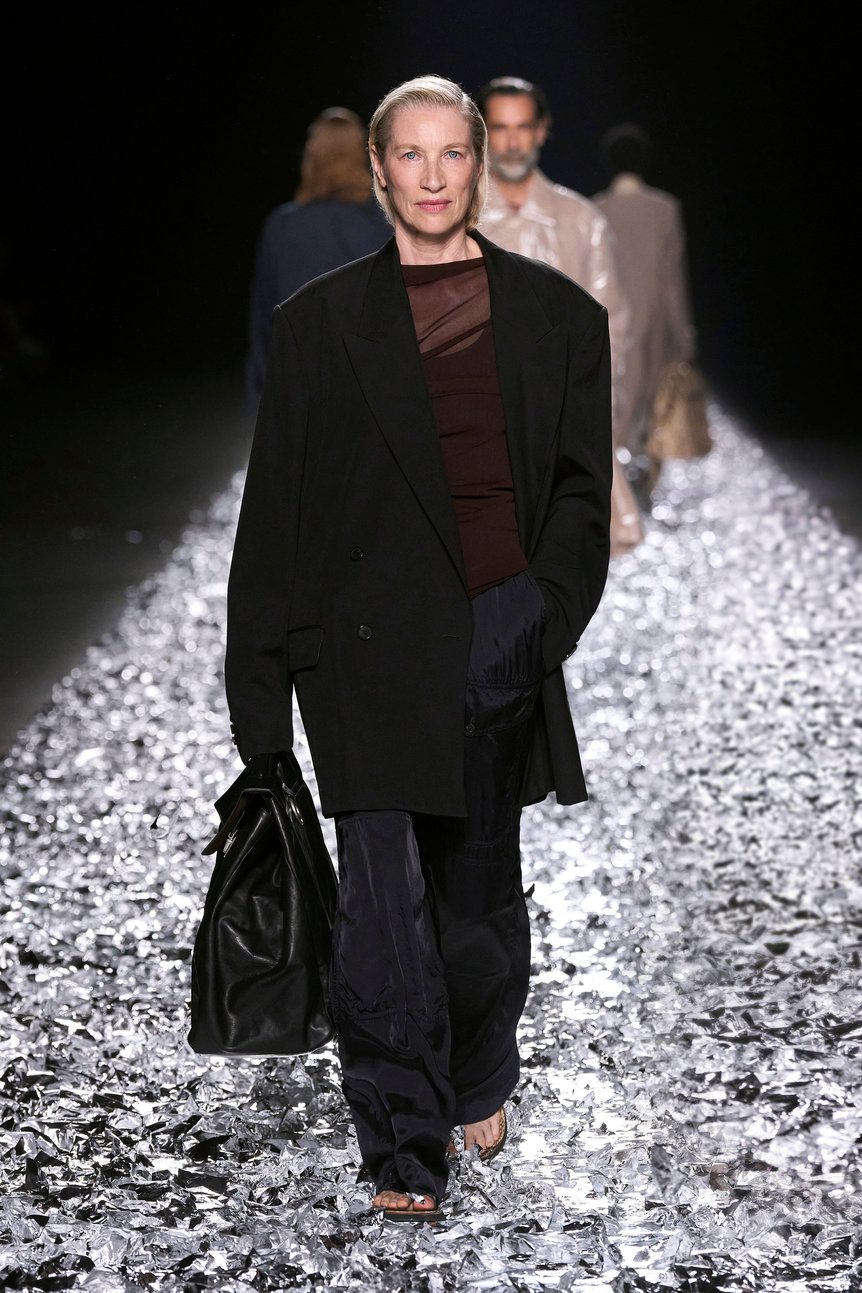 ゲストの着席後にショーは始まり、最初にその銀の道を歩いてきたのは、アライン・ゴッスアン(Alain Gossuin)だった。ドリスと同じくベルギー生まれで、現在62歳である彼は、ブランド初のランウェイとなった1992年春夏メンズショーでも歩いたモデルだ。そのほか、クリスティーナ・デ・コーニンク(Christina De Coninck)やデブラ・ショー(Debra Shaw)、カースティン・オーウェン(Kirsten Owen)など歴代のモデルから初起用の新星まで、幅広い年代のモデルが登場。「ブランドを共に築き上げてきた“ファミリー”が、この祝祭のときに一堂に会することが重要だった」とドリスはバックステージで語った。
