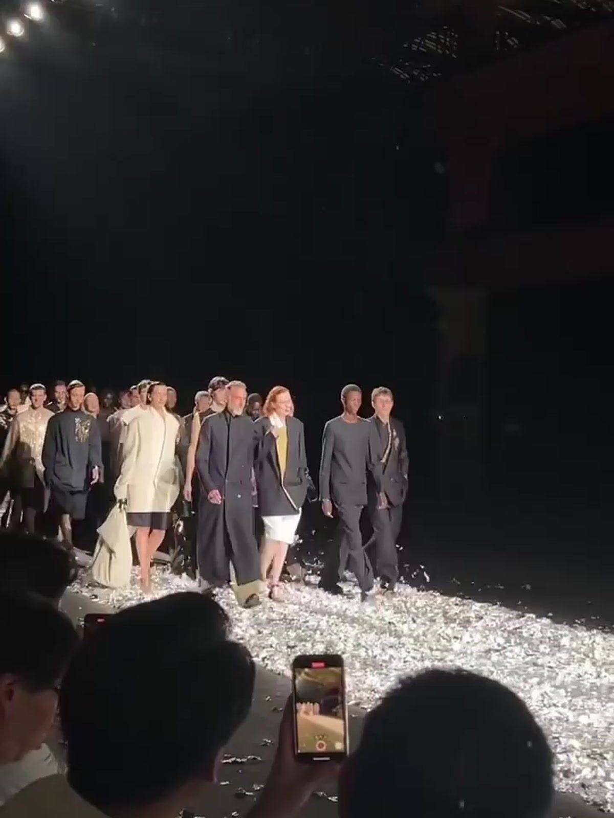 会場はパリ郊外の巨大な倉庫で、ショーの前には来場者をカクテルパーティーでもてなした。広告のためのポップスターが招かれることはなく、来場者の多くは、自前の「ドリス」を自己流に着こなしてショーに参加。中央の巨大スクリーンには過去のコレクションの映像が映し出され、誰もがさまざまな物思いにふけっていたことだろう。ショー開始の時間が近づくと、巨大な空間を仕切るカーテンが開かれ、ランウェイスペースが姿を現した。そこに照らされていたのは、一筋の銀色の道だ。よく見ると、道の上には銀箔が、会場の熱気の中でひらひらと揺れている。