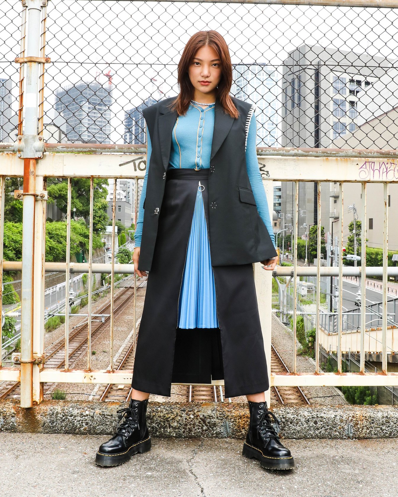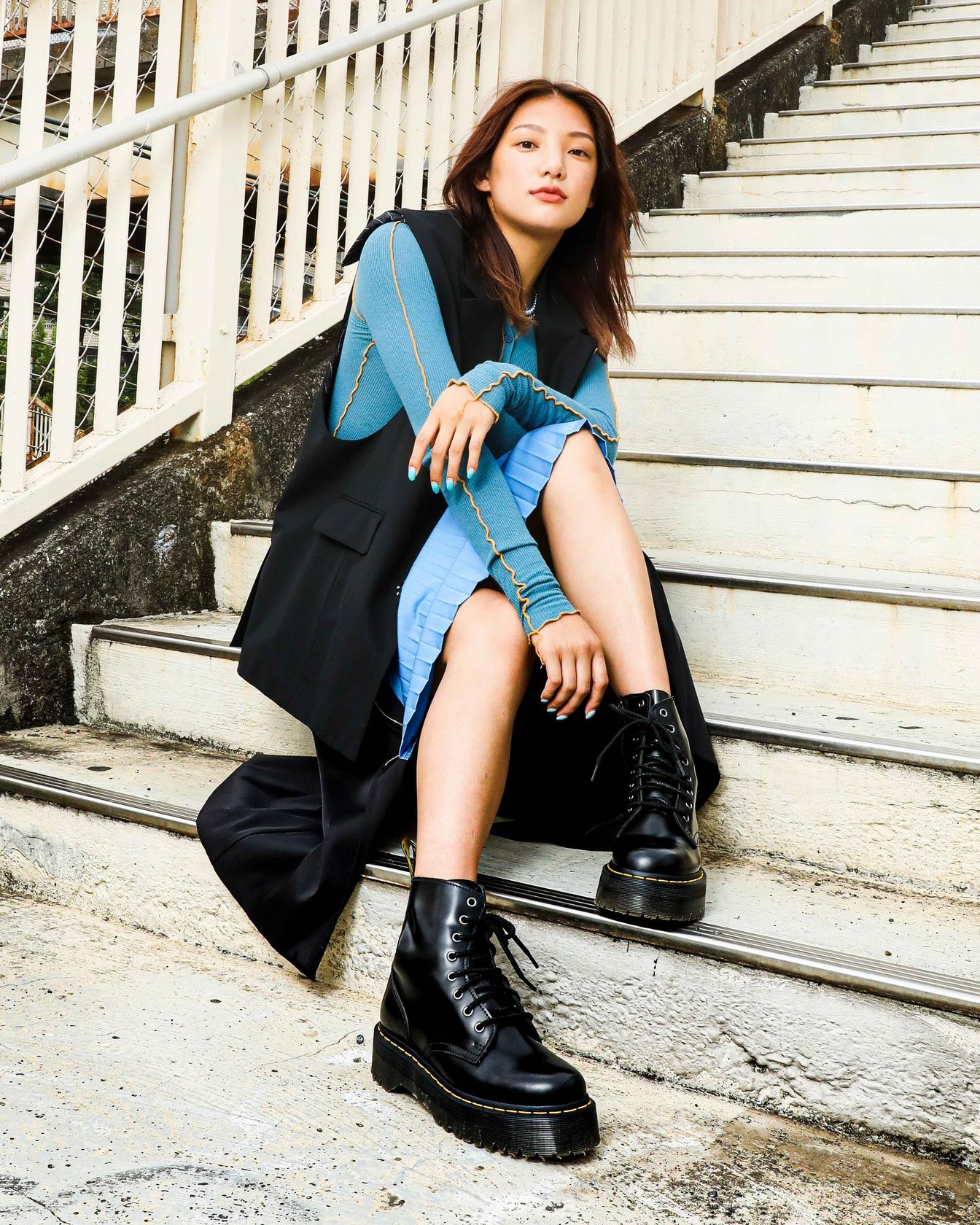アパレル・コスメ・フードデリバリーなどのプロデュースも手掛けるマルチインフルエンサーの須田アンナ。YouTubeチャンネル「アンエンユリ」でもファッショントレンドを紹介する彼女は、ブルーのプリーツスカートにスリーブレスジャケットを合わせたモードな装いで登場。足元にはドクターマーチンの「JADON」厚底 8ホールブーツを合わせた。約4cmの厚底ソールが力強さとボリューム感をプラス。ブーツの内側にサイドジップが施されており、着脱しやすい仕様となっている。