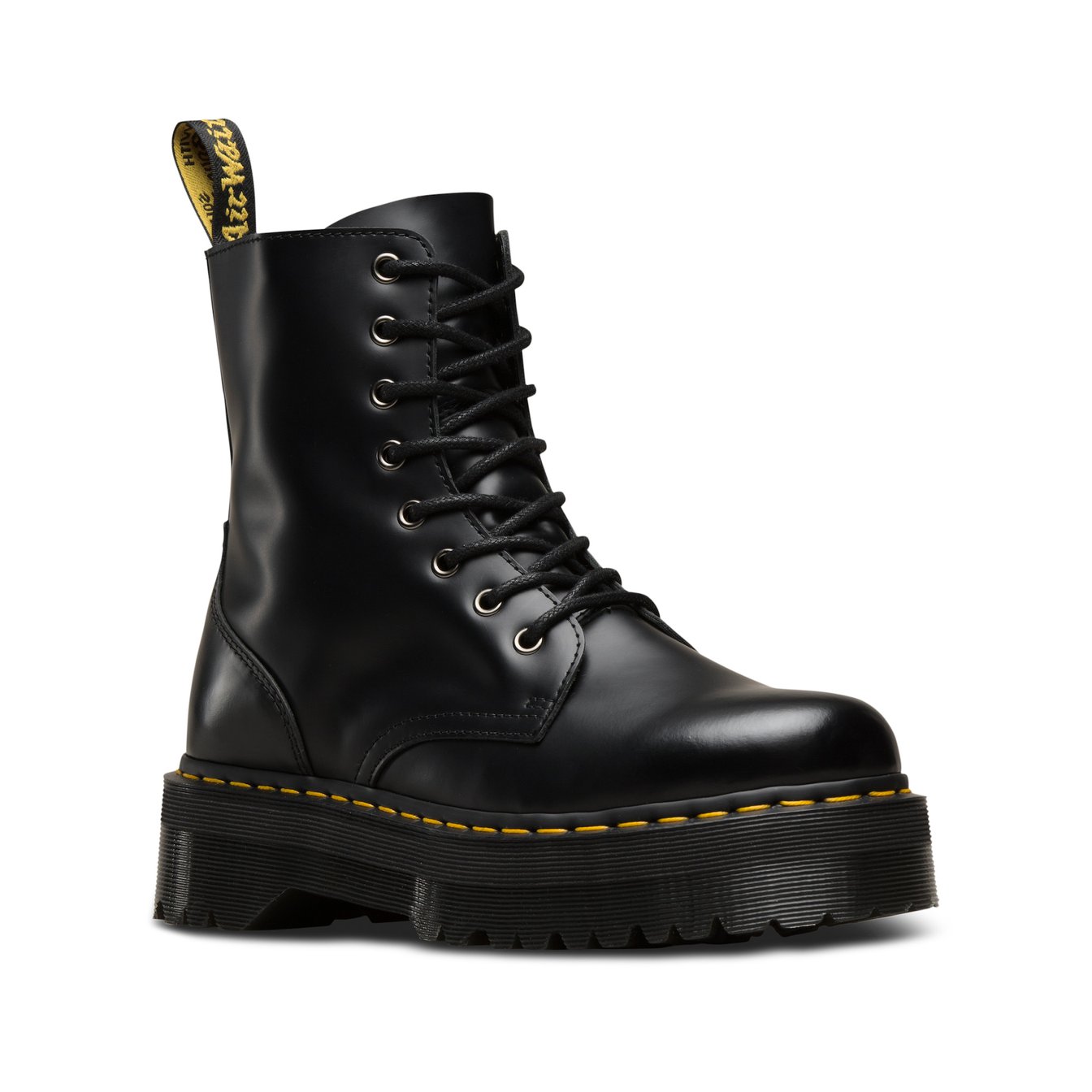 ドクターマーチンの定番である8ホールブーツと厚底ソールを組み合わせた「ジェイドン」。約4cmのプラットフォームで脚長効果も期待できそう。アッパーは、手触りの良いスムースレザーにメタリックのアイレットを合わせたデザイン。ブランドロゴ入りのヒールループと、ウェルトのイエローステッチが、ドクターマーチンならでは。