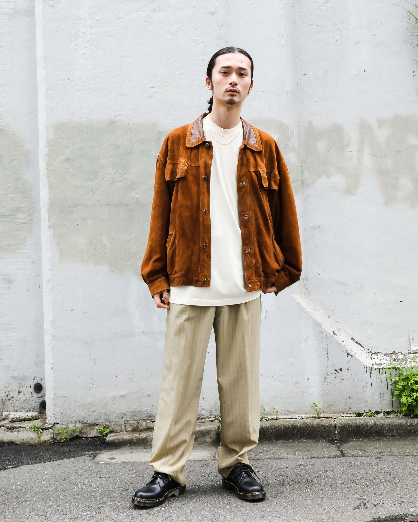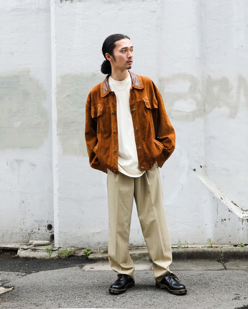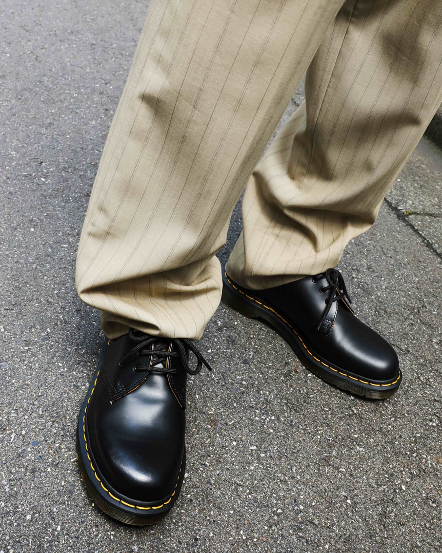 CMや映画、ミュージックビデオなど多方面で活躍するモデル・俳優の両角颯は、レザージャケットをラフに羽織ったスタイル。ボトムスにはベージュのストライプパンツと「1461」3 ホール シューズをコーディネートした。シンプルなフォルムのローカットシューズは、さまざまな丈のボトムスに合わせやすく、大人っぽいコーディネートにも自然に寄り添う。また、丈夫で肉厚なレザーアッパーも魅力的。ドクターマーチンらしいイエローのウェルトステッチが、他にはない個性を引き立てる。