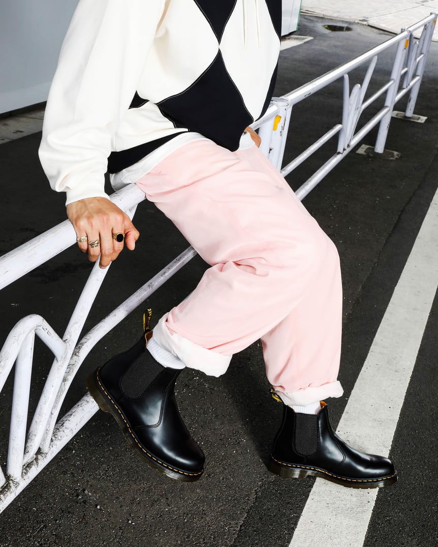 InstagramのリールやTikTok動画で注目を集めるseidaiは、22歳のモデル兼クリエイター。ダイヤ柄のフーディと、ロールアップしたライトピンクのパンツがカジュアルなムードを演出する。シューレースのない、すっきりとしたフォルムの「2976 YS」チェルシーブーツは、根強い人気の定番アイテム。履き口のヒールループや、伸縮性のあるサイドゴアが機能的だ。また、ウェルトに施されたイエローステッチが程よいアクセントをプラス。滑らかなスムースレザーが足元でリッチな光沢を放つ。