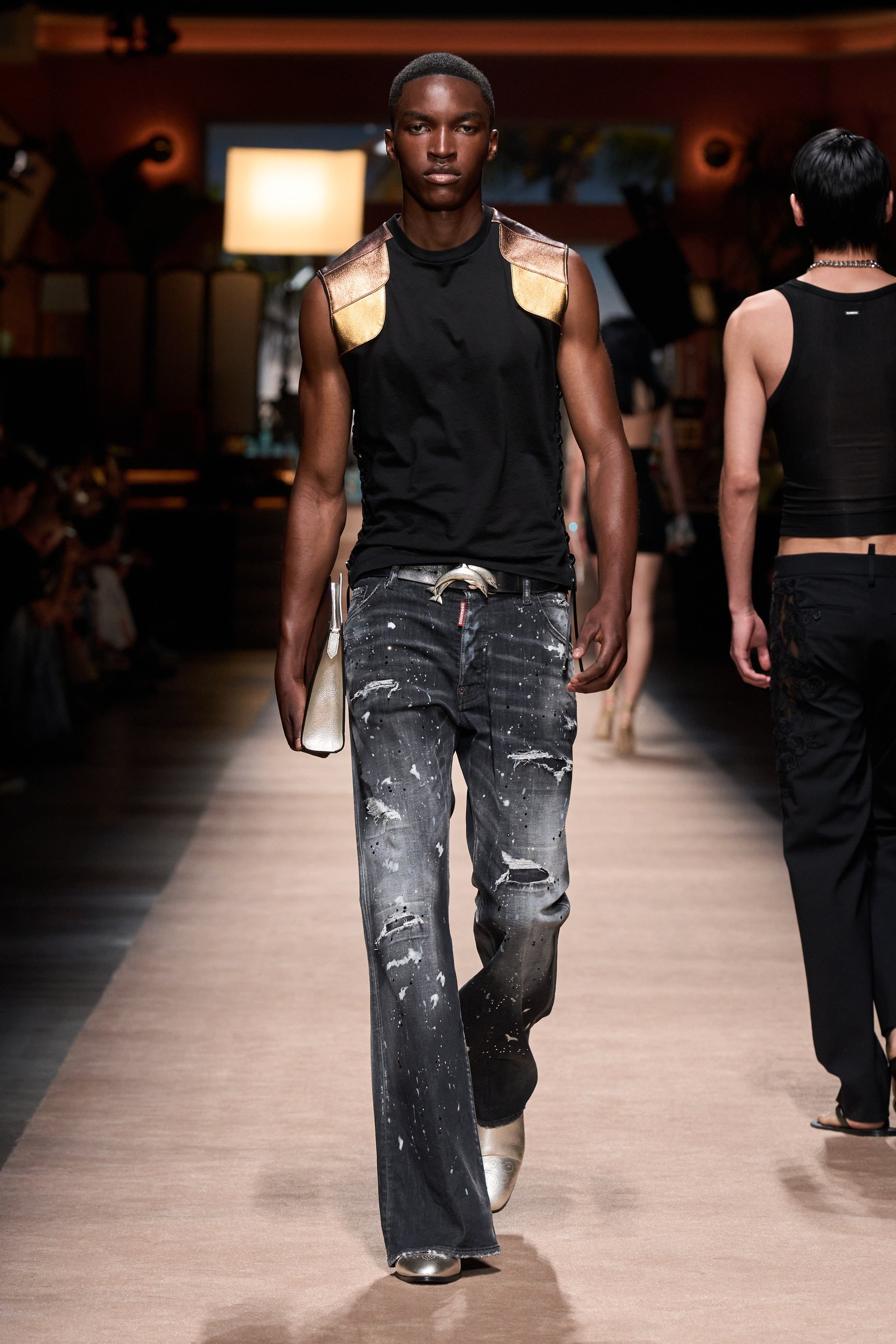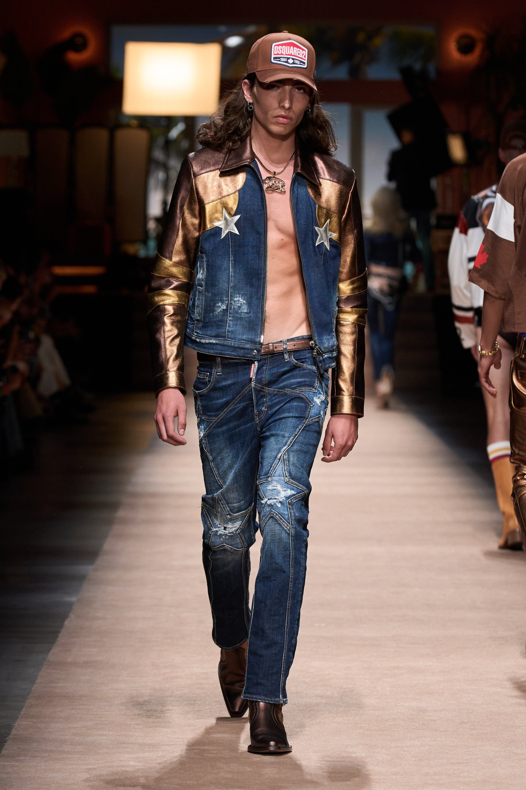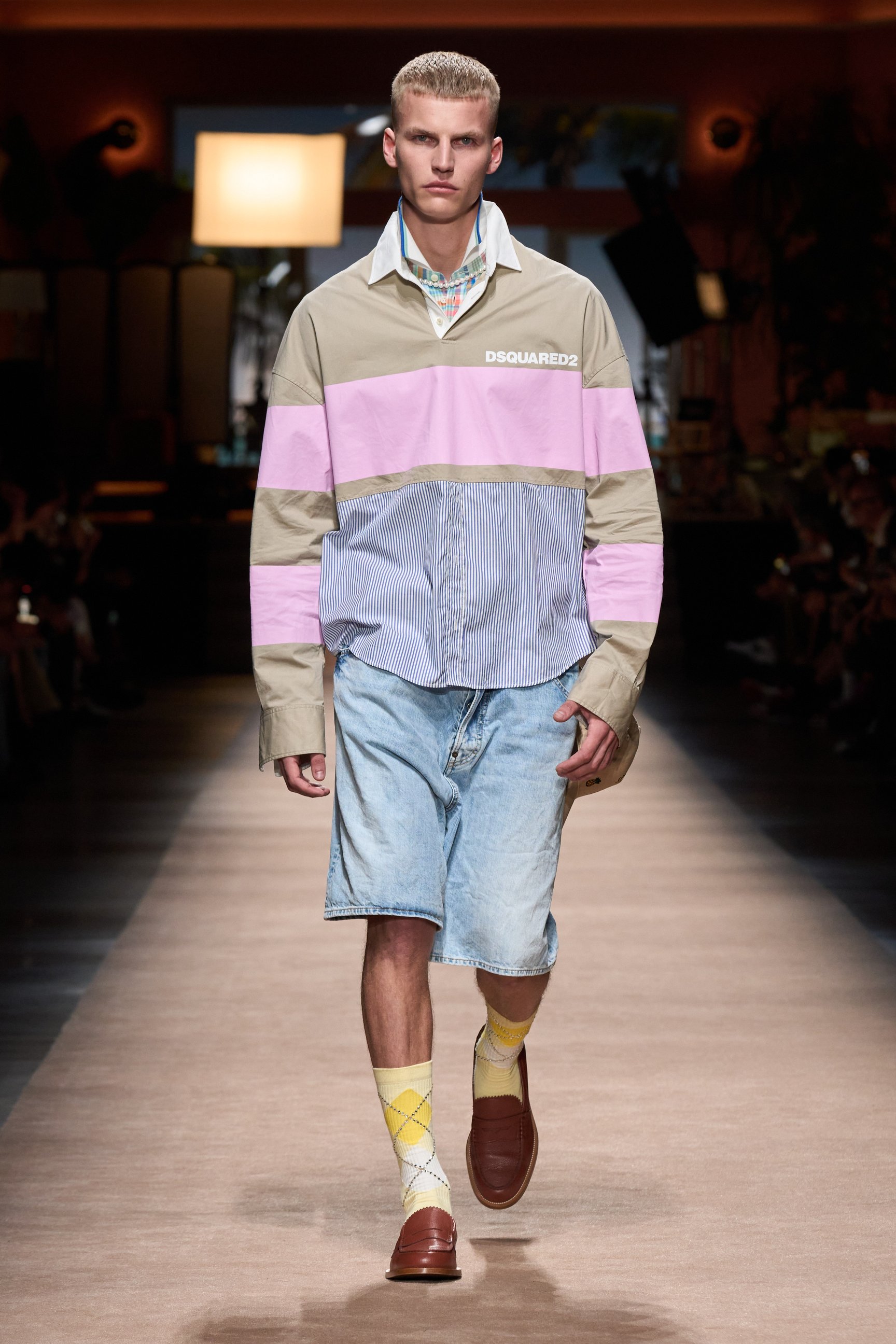 ネイビーのブレザーやアーガイルニット、ポロシャツといったプレッピーな装いも、あえて肌を露出させコントラストを演出。アーカイヴのルックも取り入れ、ディースクエアードらしいマッシュアップ作品を作り上げた。
