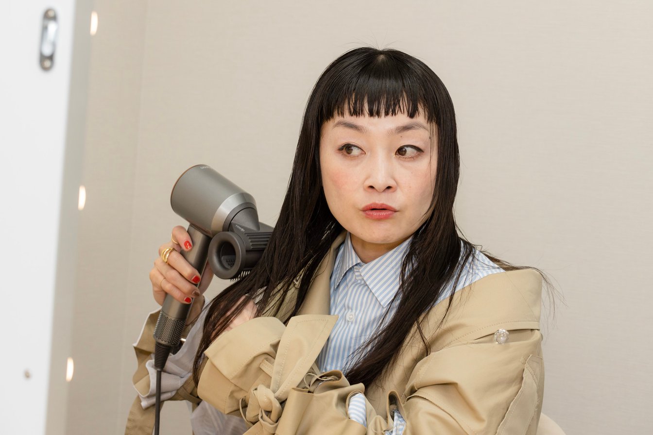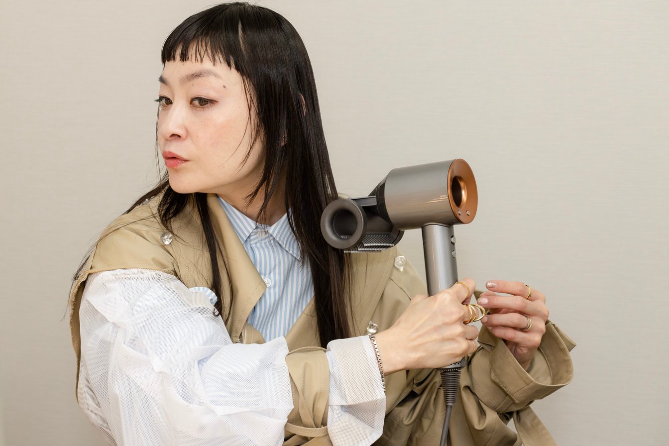 今回のランウェイショー潜入のため、まずはヘアスタイルをチェンジ。BASE MARKのバックステージにも採用された、最新の日本限定モデル Dyson Supersonic Shine ヘアドライヤーで髪を整えていきます。トレードマークのお団子をほどきながら、「楽だからお団子にしてるんだけど、髪をおろしたい願望はあるんですよ」とシトウさん。Dyson Supersonic Shineヘアドライヤーの魅力は、2つのモードを備えた最新の「ツヤ出しツール」が加わり、既存の「低温ツール」と「なめらかツール」を合わせ、3種類のアタッチメントがあること。これらのアタッチメントで低温なのに速乾で、浮き毛やうねりの少ない、サロン級のツヤ髪をセルフで再現できます。ヘアスタイリストに使い方を教わりながら、シトウさん自身もトライ!