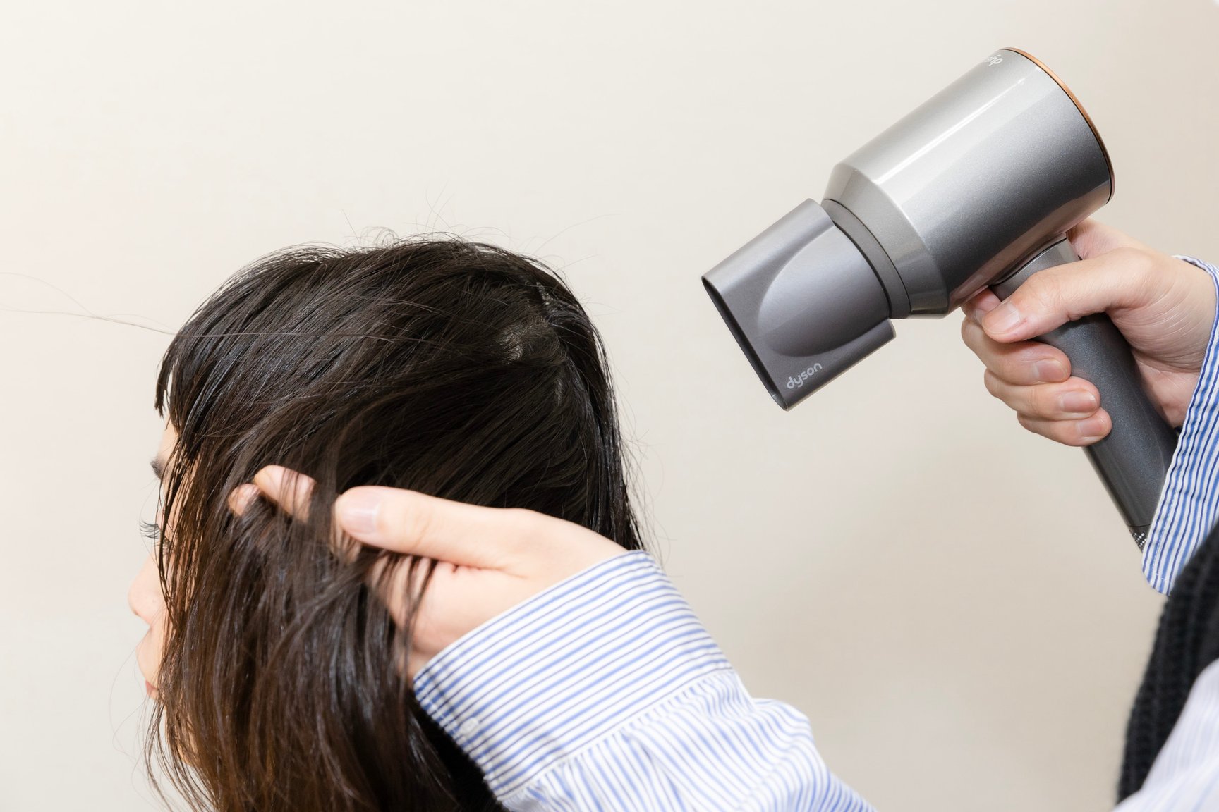 まずはお風呂上がりをイメージして髪を濡らし、毛先中心にオイルで整えます。そしてDyson Supersonic Shine ヘアドライヤーの低温ツール、なめらかツールでブロー。髪は根元から毛先に向かって生えているため、毛流れにそって7〜8割、乾かすのがポイント。低温ツールは、低温の風で細い髪やデリケートな頭皮をすばやく乾かしたいときに活躍します。なめらかツールは、まるでシルクのような指通りになるのが特徴。「全然熱くないですね」と、低温なのにすばやく乾いていく髪に驚きを隠せないシトウさん。根元から毛先へ動かすだけの、なめらかツールも「不器用なんですが、これなら私でもできそうです」。