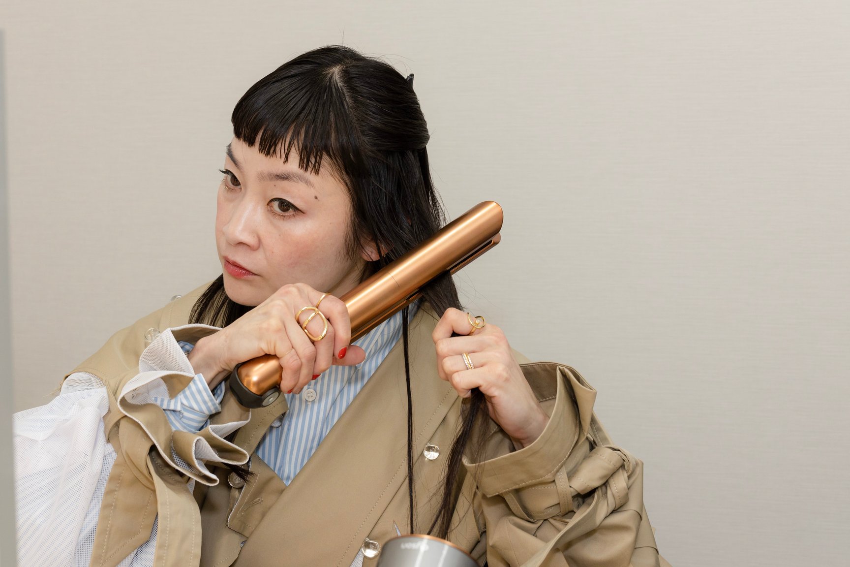 最後はコードレスヘアアイロン、「Dyson Corrale™」で理想の髪型に近づけます。いつもはお団子ヘアのシトウさん。うねりやくせ毛がなめらかにまとまり、ストレートヘアに。「コードレスなのもいいですよね。電源を気にせず場所も選びません。数日の出張ならこれで十分ですね」