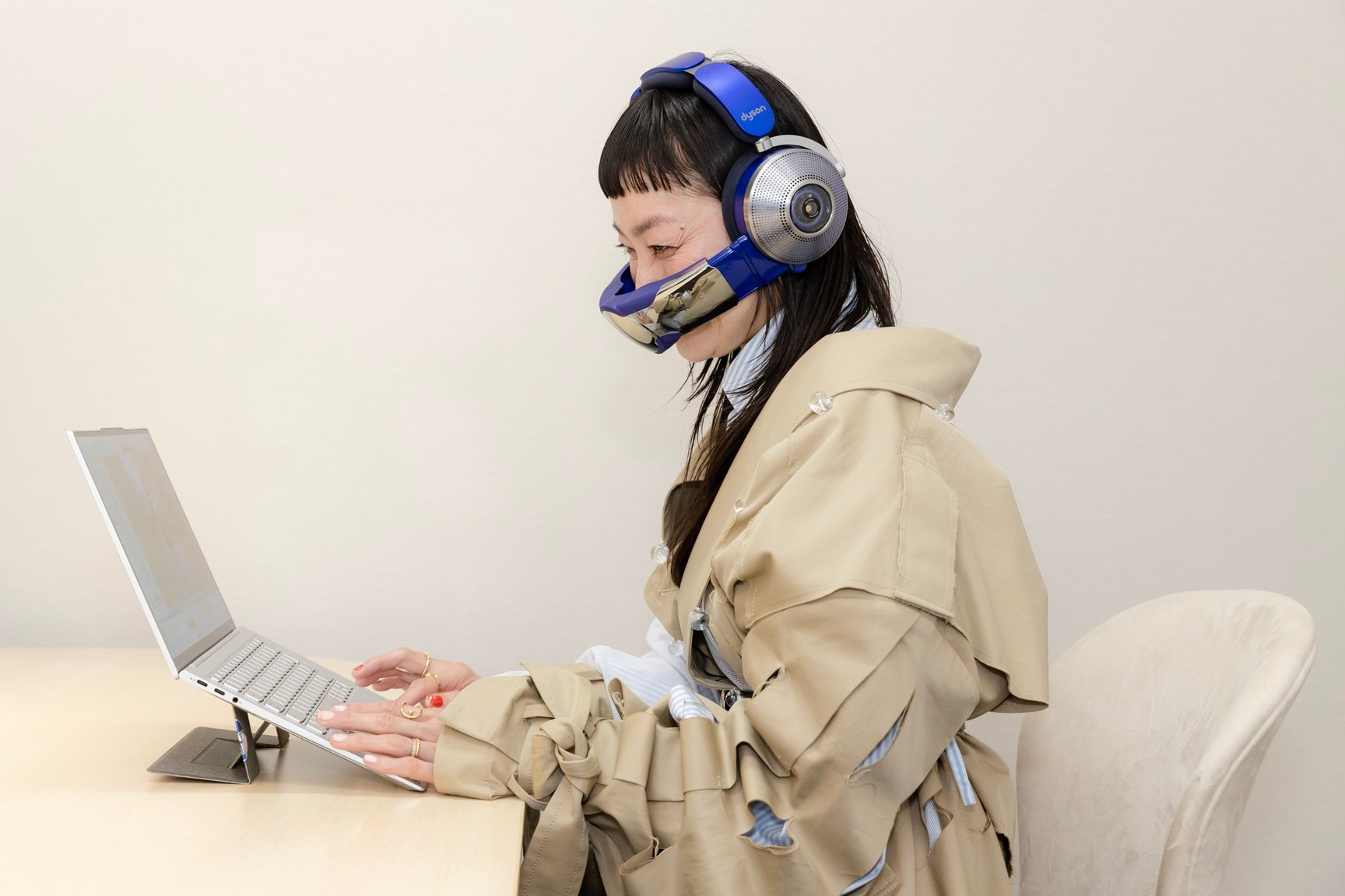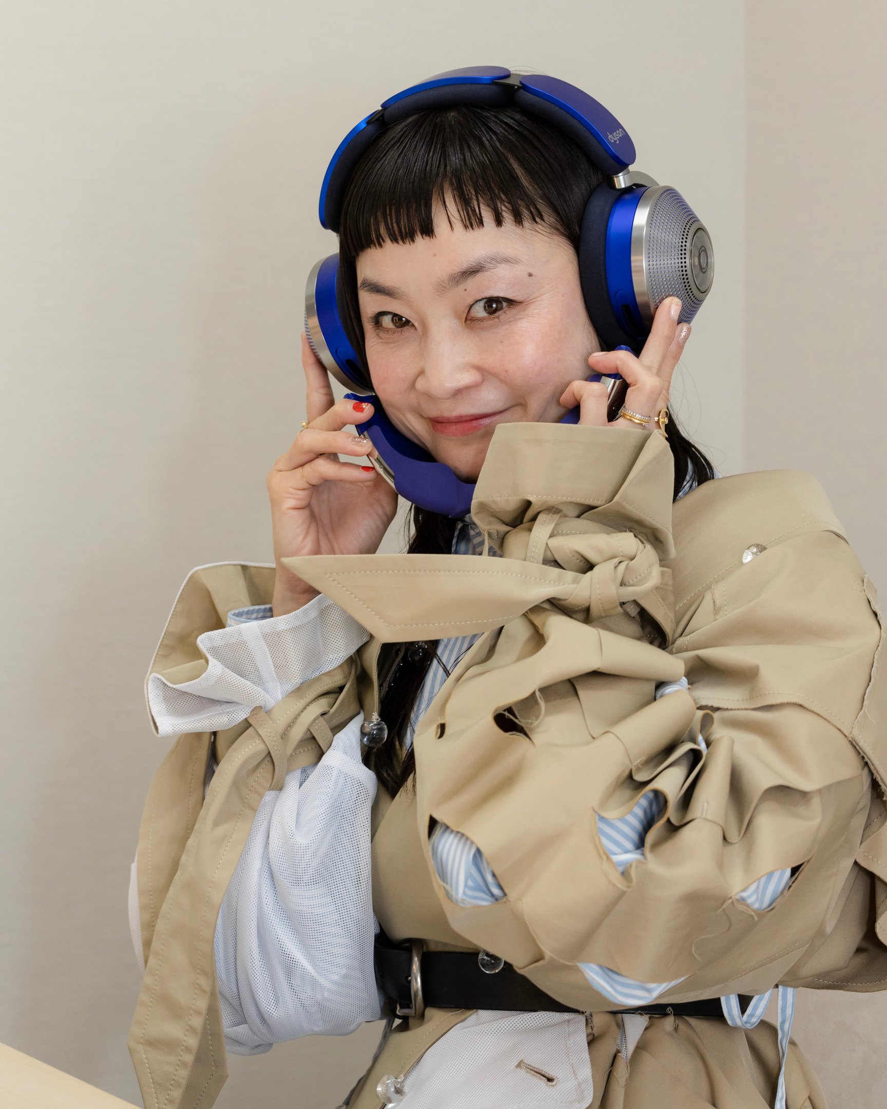 ストレートヘアに“変身”したあと、休憩時間にhayateさんへのインタビューに備え準備をするシトウさん。そこで体験したのがダイソンの最新のテクノロジーが搭載された空気清浄ヘッドフォン「Dyson Zone」。高度なノイズキャンセリング技術で再生音の歪みを極限まで抑えた設計で快適な音楽鑑賞とともに、非接触型シールドで浄化された空気も届きます。「すごい!画期的。いつか日本で発売されるの、楽しみですね」とシトウさん。日本での展開は未定。