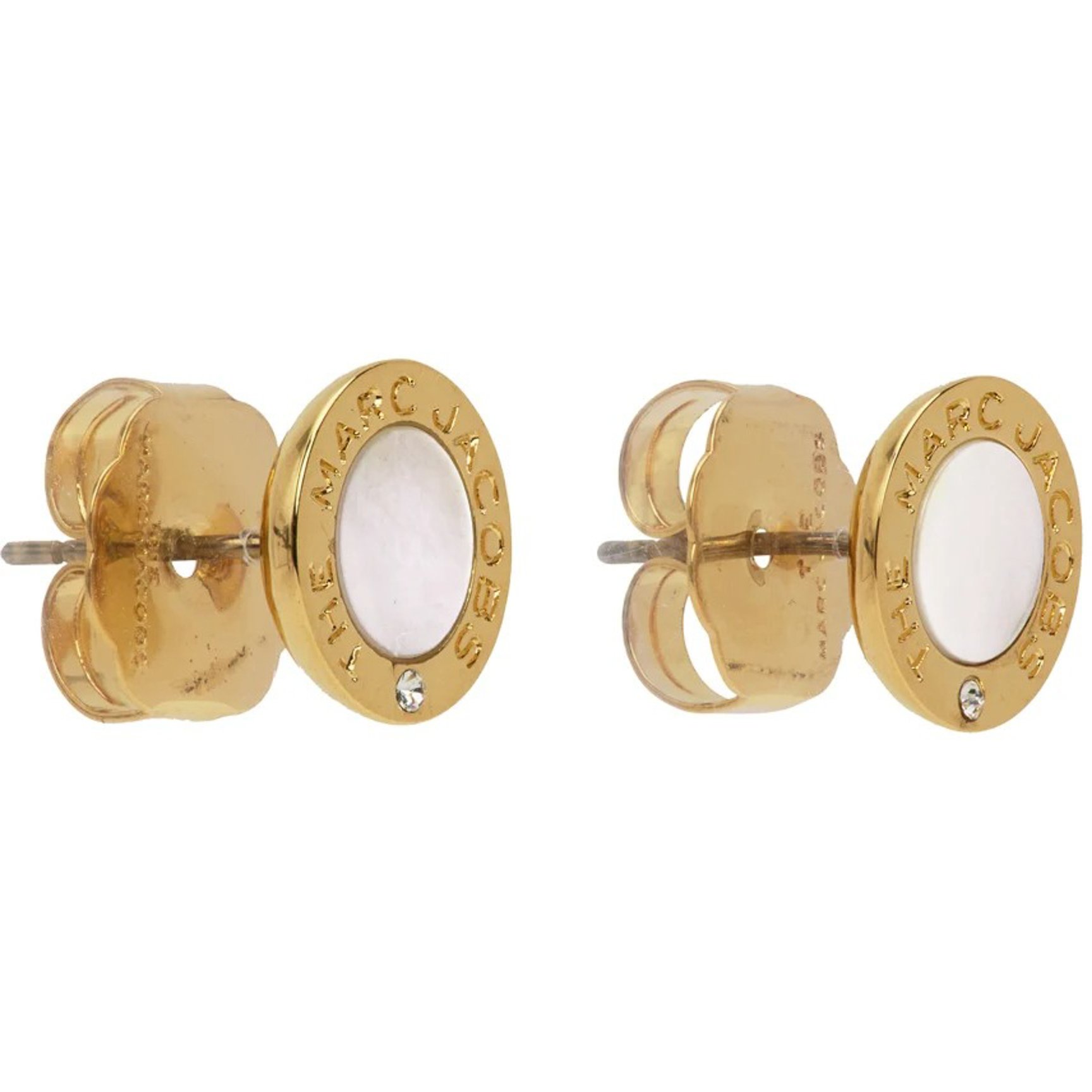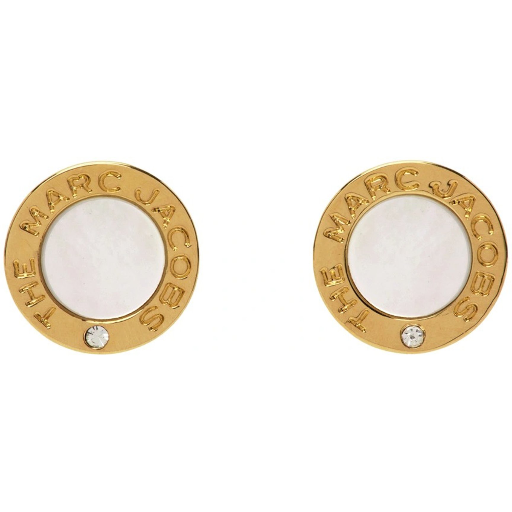マザーオブパールの周りをゴールドで囲んだ「マーク・ジェイコブス(MARC JACOBS)」のスタッドピアス。ゴールド部分に刻印されたロゴや、クリスタルカットのさり気ないアクセントが上品。