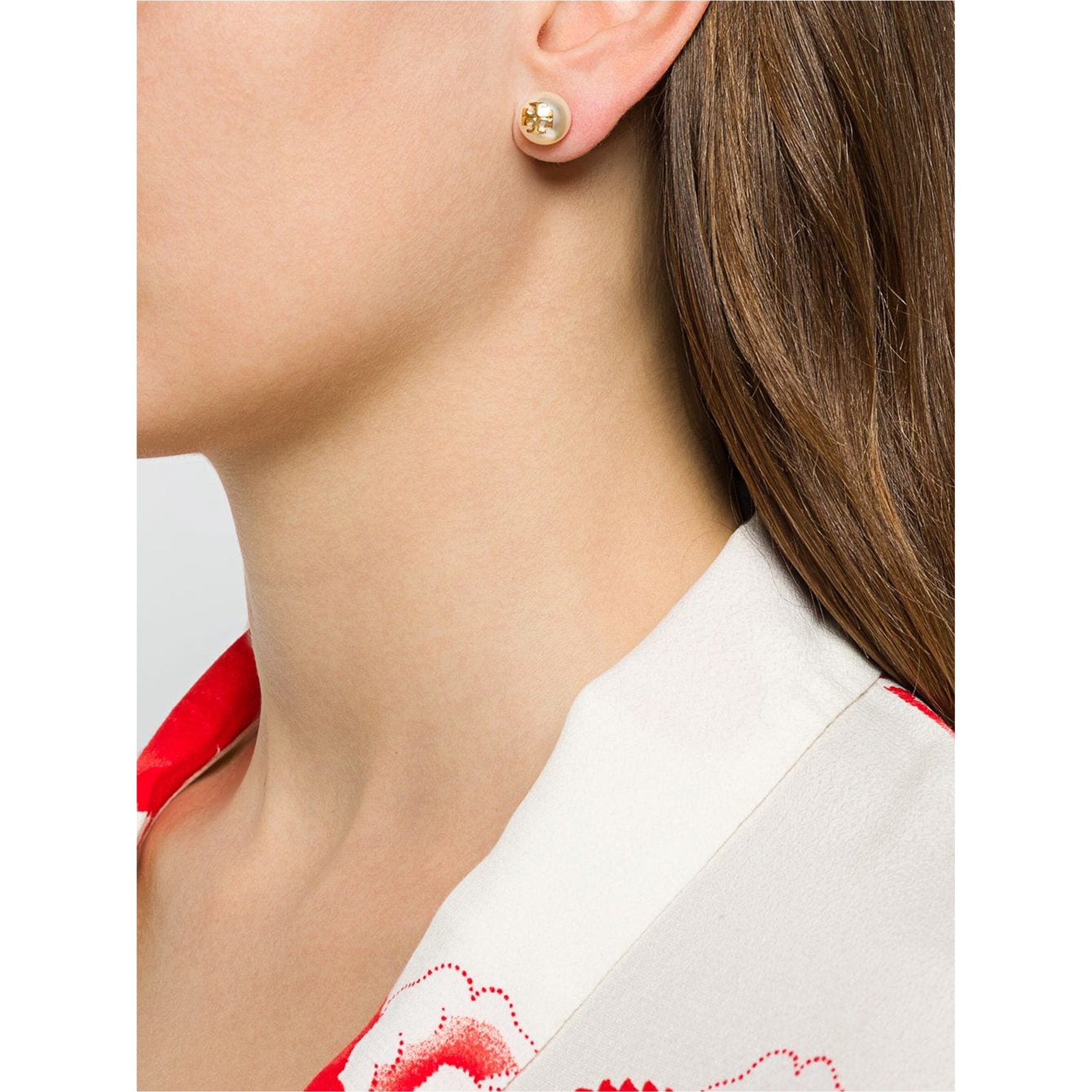 パールにひとくせ欲しいなら、「トリー バーチ(TORY BURCH)」に注目。表面にゴールドの小さなダブルTをあしらった、エレガントなデザインのピアスです。