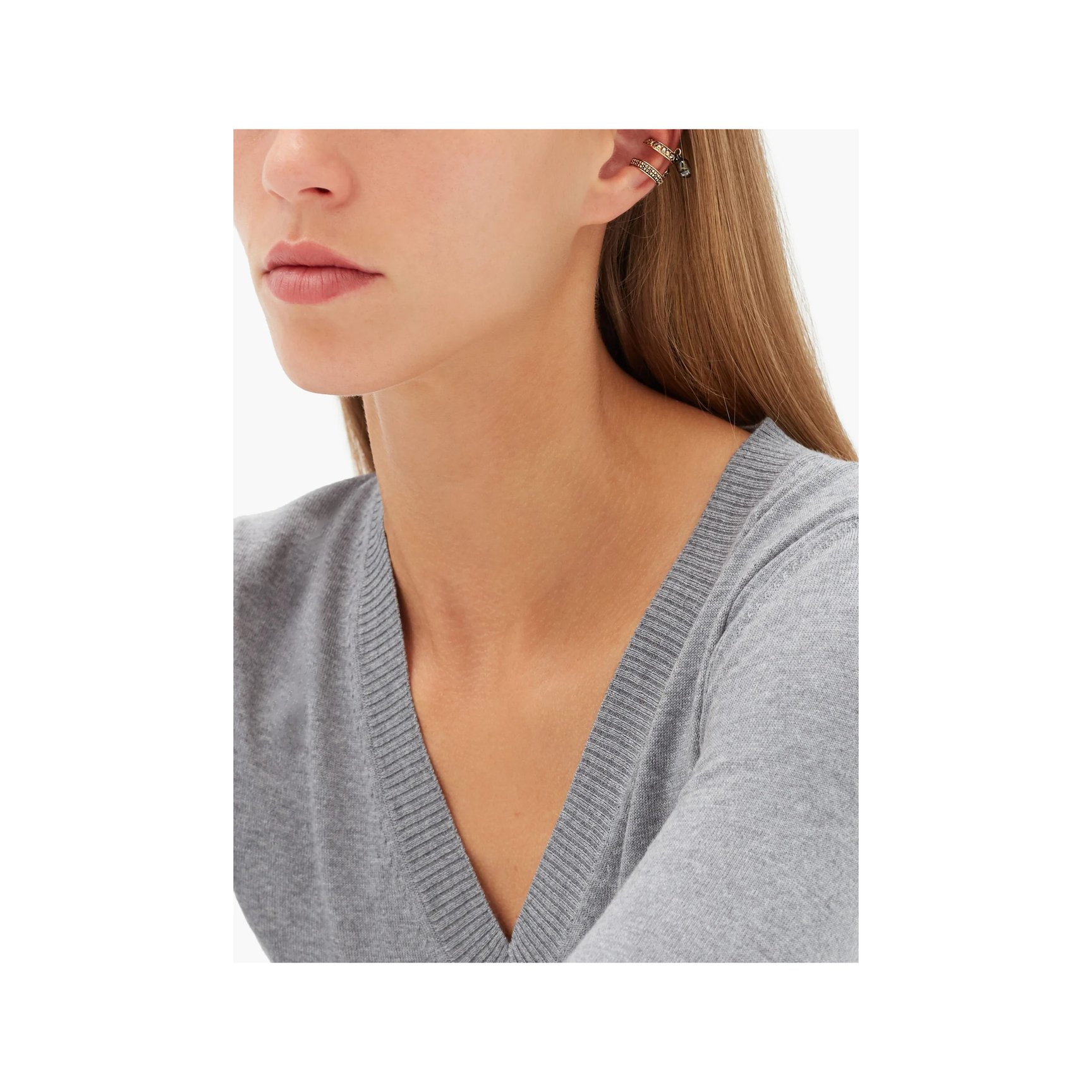 「アレキサンダー・マックイーン(Alexander McQueen)」のイヤーカフ。2つ連なったフープには、それぞれ彫刻と小さなスタッズが。おなじみのスカルモチーフが、耳元で揺れます。エッジの効いたデザインで、デイルックにスパイスを加えてみては。
