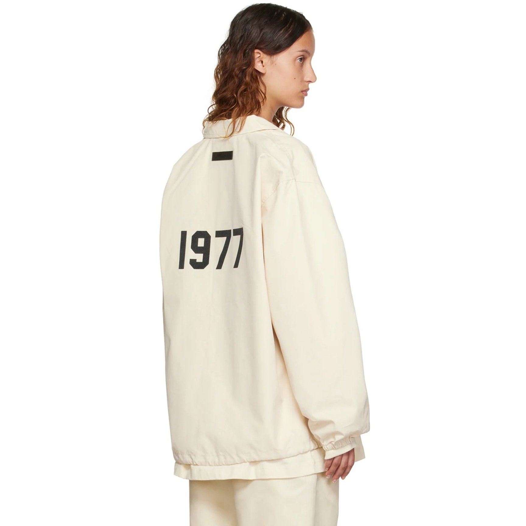 コットン x ポリエステル混ツイルを使用した、コーチジャケットタイプの丈夫なアウター。ゆったりとしたシルエットのバックには、デザイナーのロレンゾが誕生した年“1977”を大胆にプリントしたインパクトのある一着です。