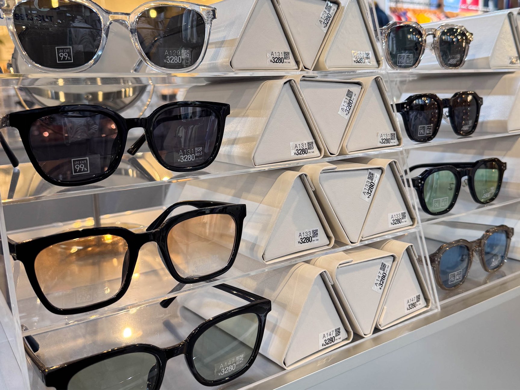 アイウェアは約150種類をラインナップし、価格は平均3500円ほど。人気のメタルフレームやリムレスはもちろん、ベッコウ風デザインのメガネ、トレンドのスクエア型のサングラス、ゴーグルのようなシェイプが特徴のスポーツサングラスなど、さまざまな形のものを揃えています。
