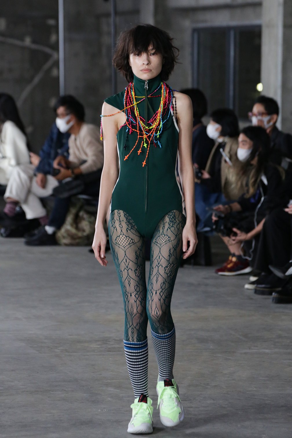 ベースは7月に映像で発表した2021年春夏のメンズ・ウィメンズコレクションだが、今回のショーのために15ピースほどをプラス。コロナ禍で服の可能性について考えながら、前向きな気持ちで制作したという。トラックスーツやタキシードジャケット、トレンチコートといった定番アイテムをカットアウトしたり異素材を重ねたり、独特なひねりはファセッタズムの強み。パッチワークやレイヤードが、東京のランウェイによく映える。「ジョーダン ブランド(JORDAN BRAND)」のロゴ入りのセットアップも目に入った。