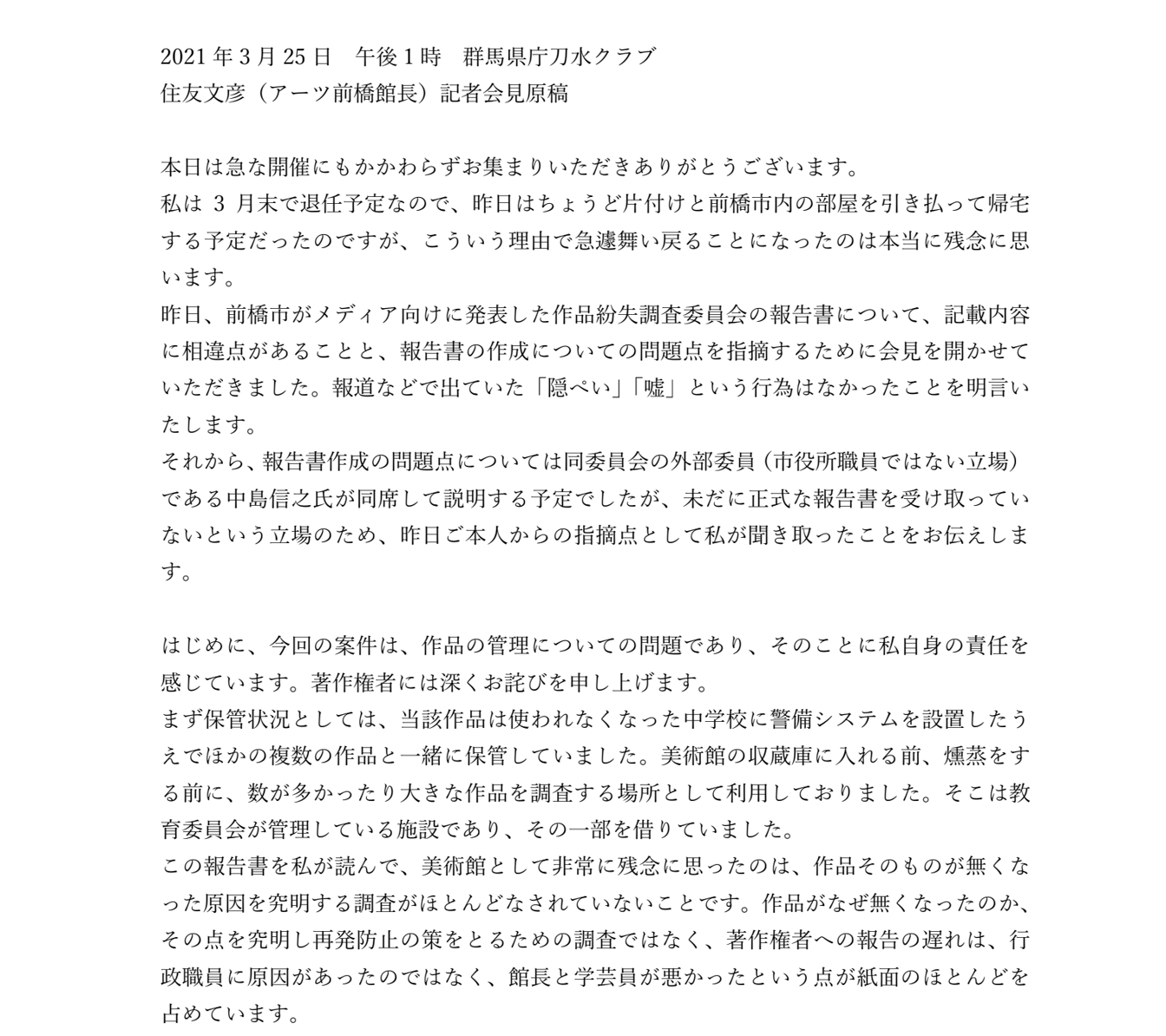 2018年12月17日、アーツ前橋は群馬県高崎市出身の物故作家2人の作品52点を遺族から預かり、旧前橋市立第二中学校のパソコン室に搬入した。2020年1月6日、このうち3点が見当たらないことを学芸員が確認、2月3日には合計6点(木版画4点と書2点)の紛失が判明した。市長への報告から対外公表までの遅れにより作品紛失だけでなく「隠蔽」の批判も起きた事件である。本件の背景には労務問題もあると言われており、また今回のファーレ立川の事件とは直接的には何らの関係もないものではあるが、前橋市という中核市の持つアートセンターでの事件ということもあり、また館長であった住友文彦氏による反論が市長側の認識と大きく食い違っていたことなどでも話題となった。