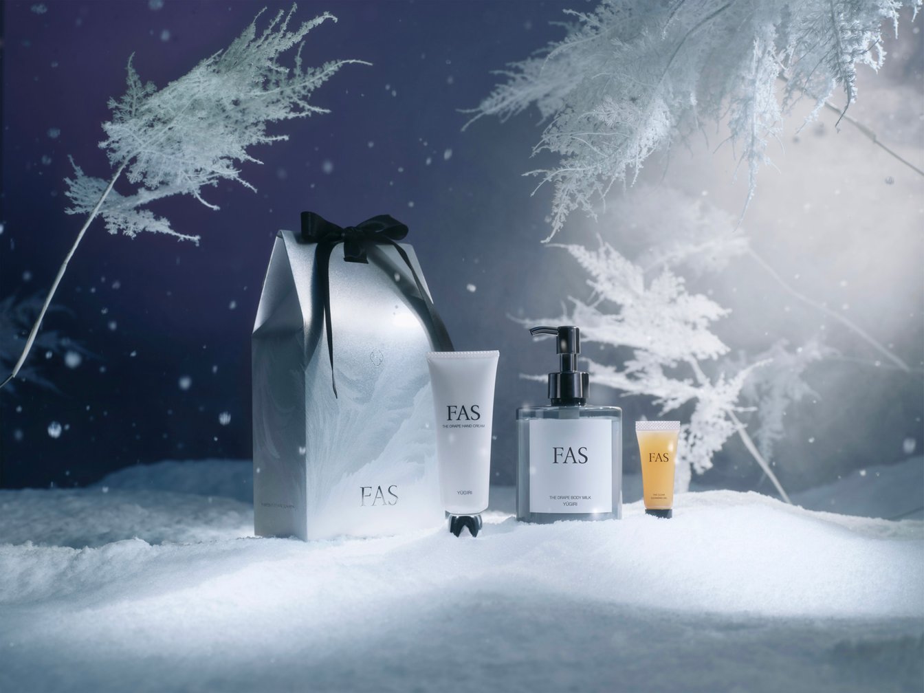 新シリーズ「FAS ザ ドレープ」のボディクリーム&ハンドクリームに、人気のクレンジングジェルのミニサイズを組み合わせたセット。秋の終わりの幻想的なひとときをイメージした「YŪGIRI」と、静ひつで凜とした空気の中に、春を待つ草木の気配を重ねた「HATSUNONE」の2種類から、好みの香りを選ぶことができます。