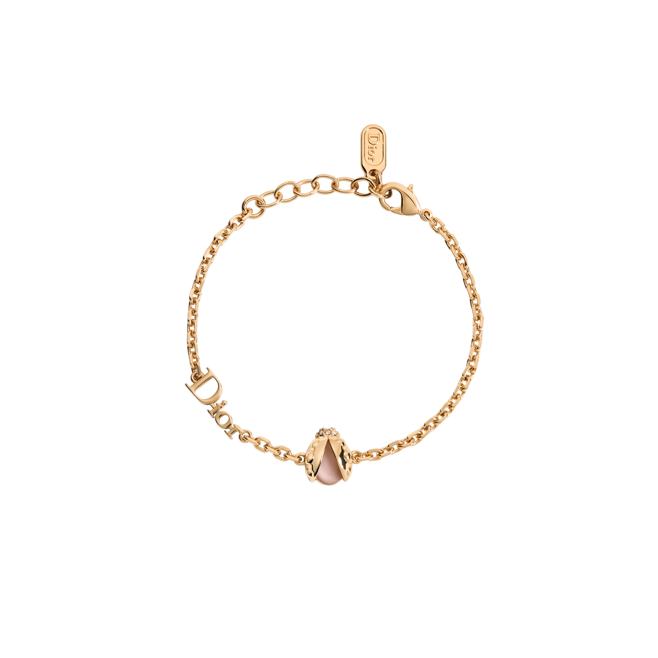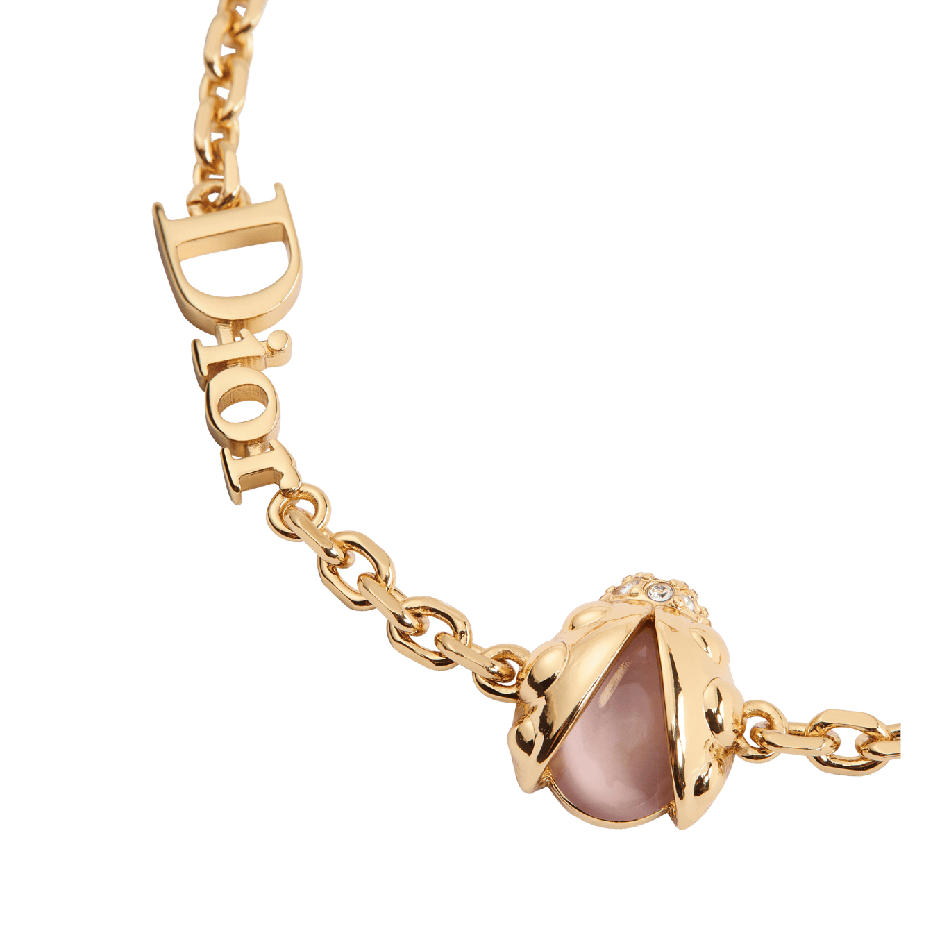 ロゴをあしらったチェーンリンクに、ゴールドトーンメタルとピンクのガラス、クリスタルを組み合わせた優美なてんとう虫が輝くブレスレット。てんとう虫は、クリスチャン・ディオールにとってラッキーチャームでもある。