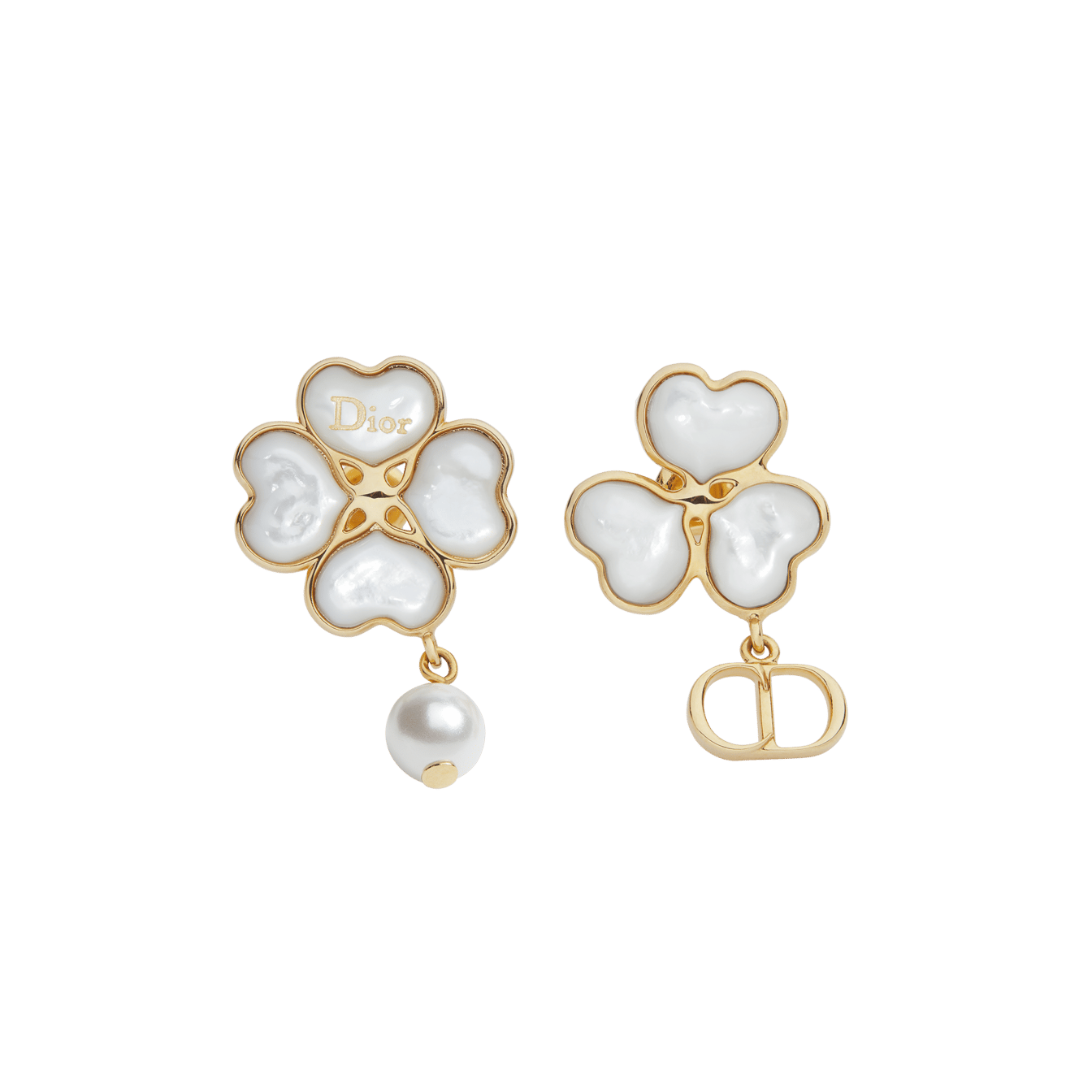 ゴールドトーンメタルを使用したアシンメトリーなクローバーがセットになったピアス。クローバーにはマザーオブパールの繊細な装飾を施し、片方にはCDシグネチャーを、もう片方にはホワイトのレジンパールをプラス。